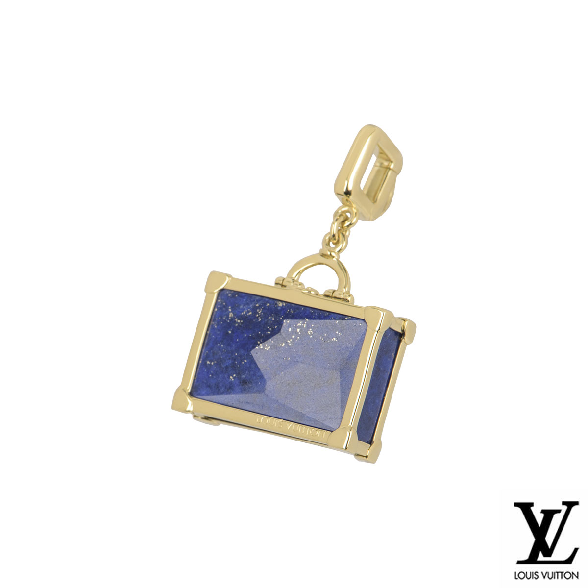 An 18k yellow gold suitcase charm by Louis Vuitton. The charm is in the design of a suitcase set with a lapis lazuli centre with yellow gold borders. The charm features a push clasp and measures 1.50cm in width and 2.20cm in length and has a gross weight of 12.70 grams.