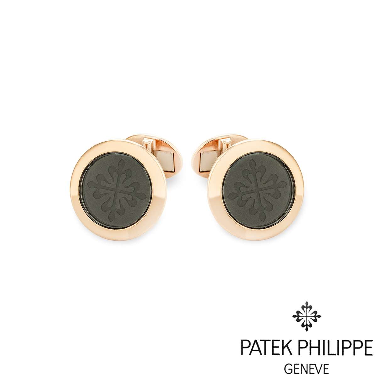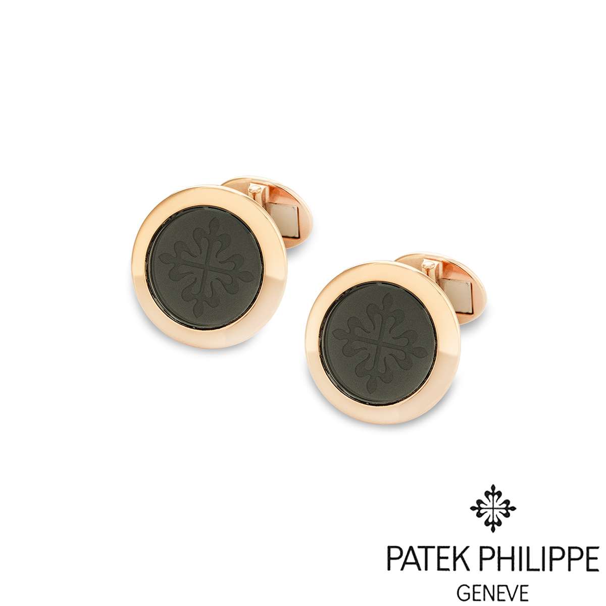 A pair of Patek Philippe Calatrava Cufflinks, Ref. 205.9107R-001, available now at RichDiamonds London. A must-have accessory crafted from 18K rose gold. Each cufflink features a black onyx centre, engraved with the iconic Calatrava cross emblem, protected by a sleek sapphire crystal. Securely fastened with a whale-back fitting. The cufflinks measure approximately 18 mm in diameter, approximately 22 mm in length and have a gross weight of 22.6g.