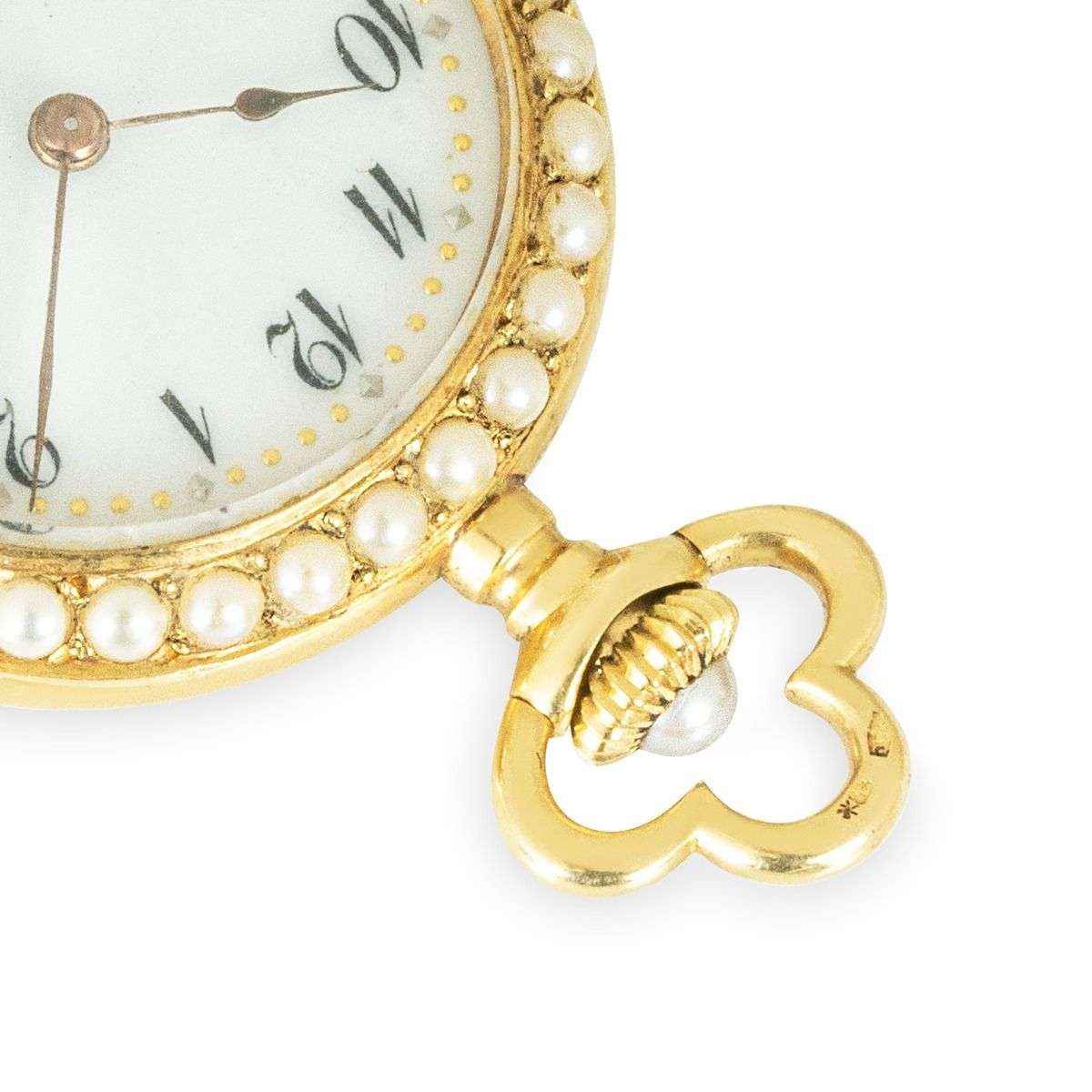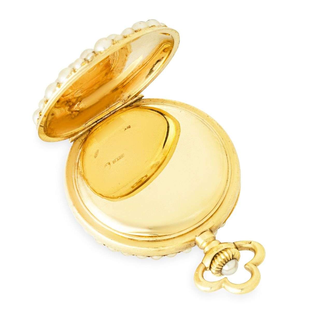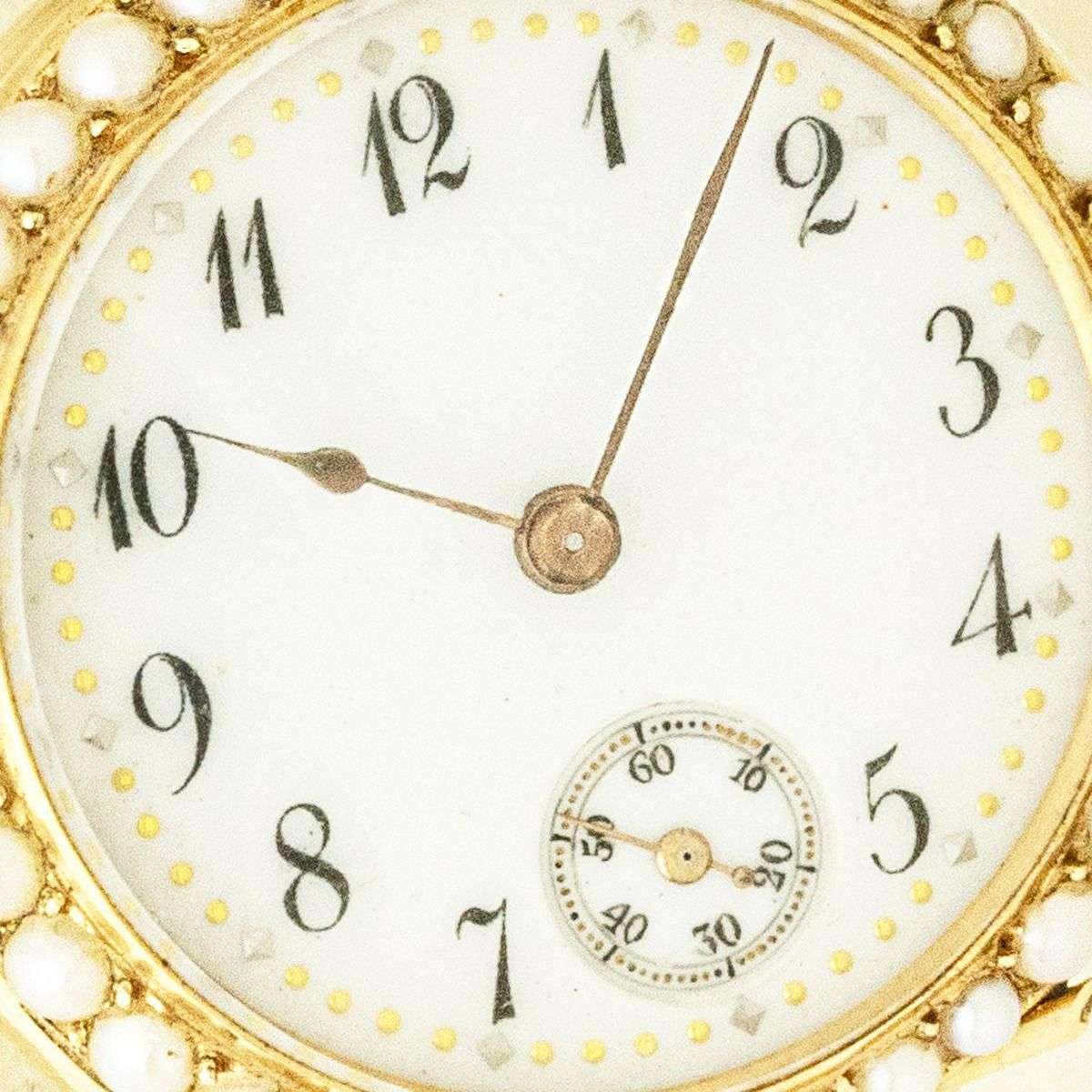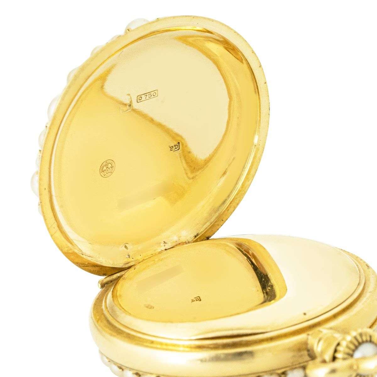 Case: The superb 18ct yellow gold case is set with fine half seed pearls to the front bezel. The back of the case is finely set with seed pearls. The winder is also set with a seed pearl. The inner cover is plain. The case is stamped PD, having Swiss hallmarks and being numbered aswell.