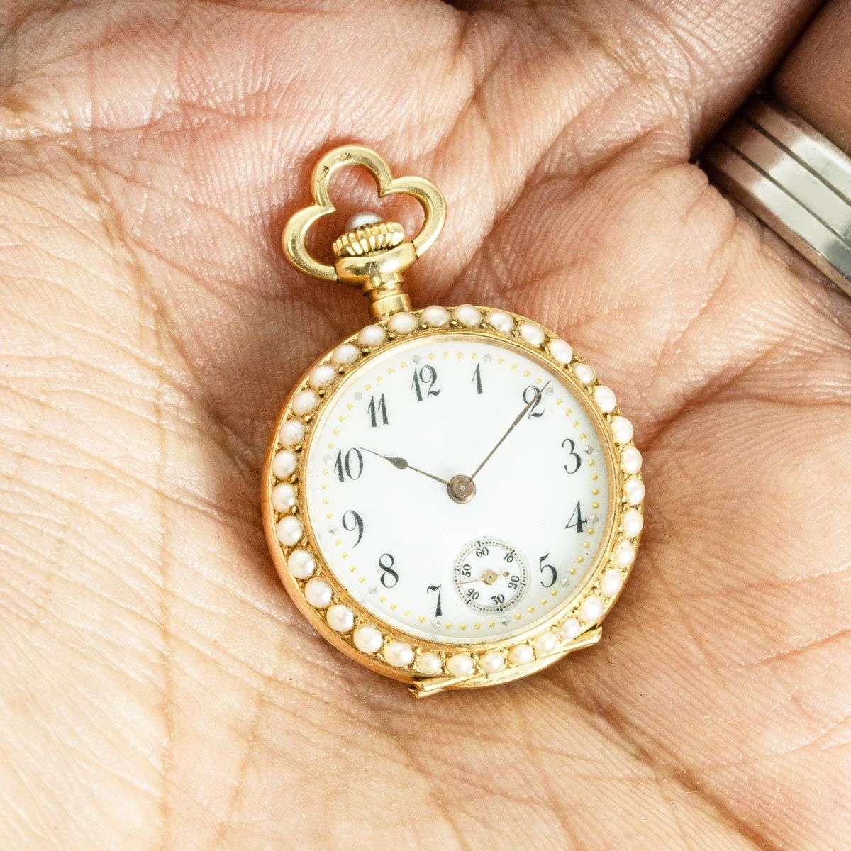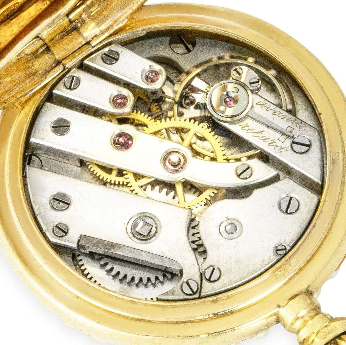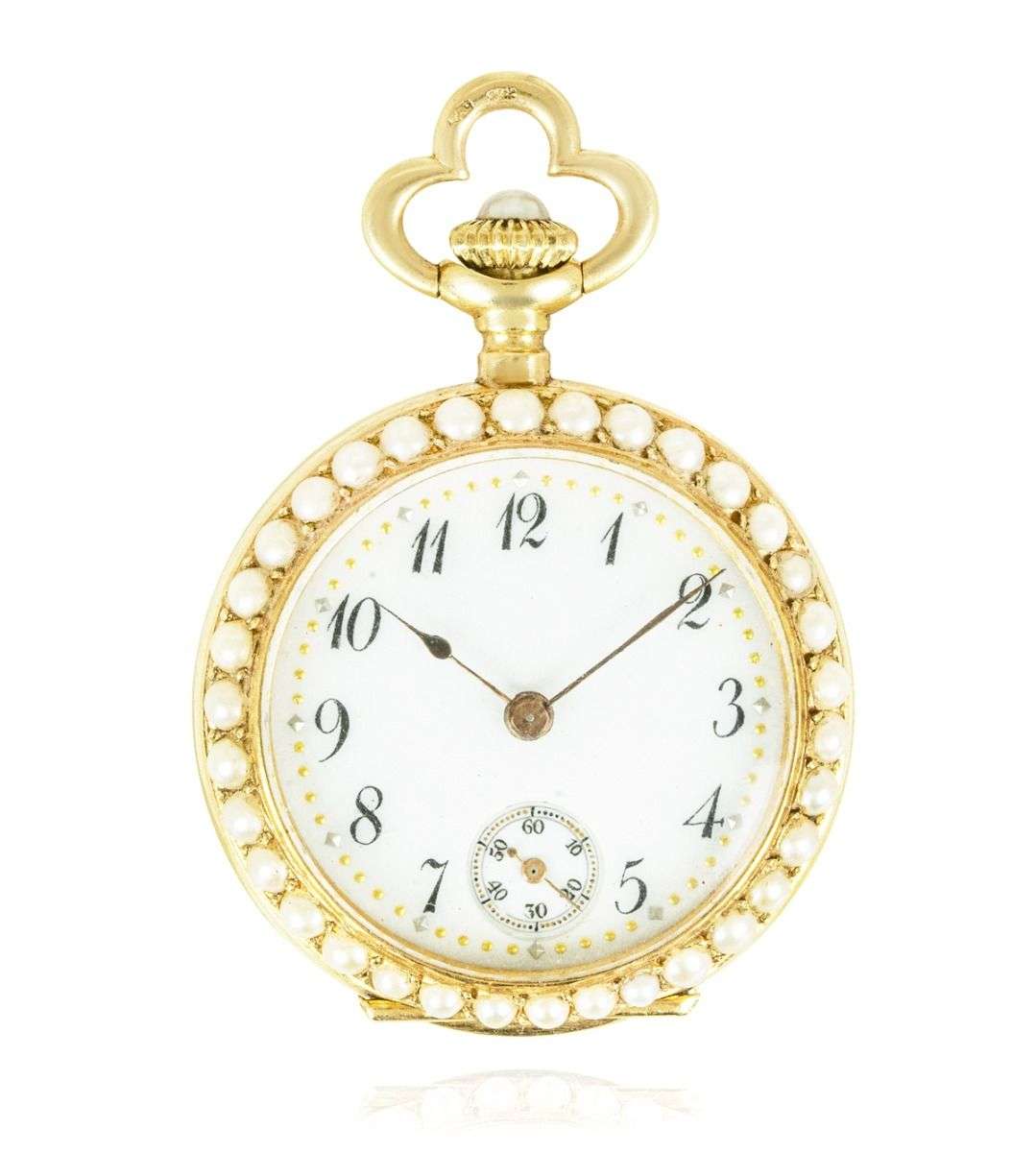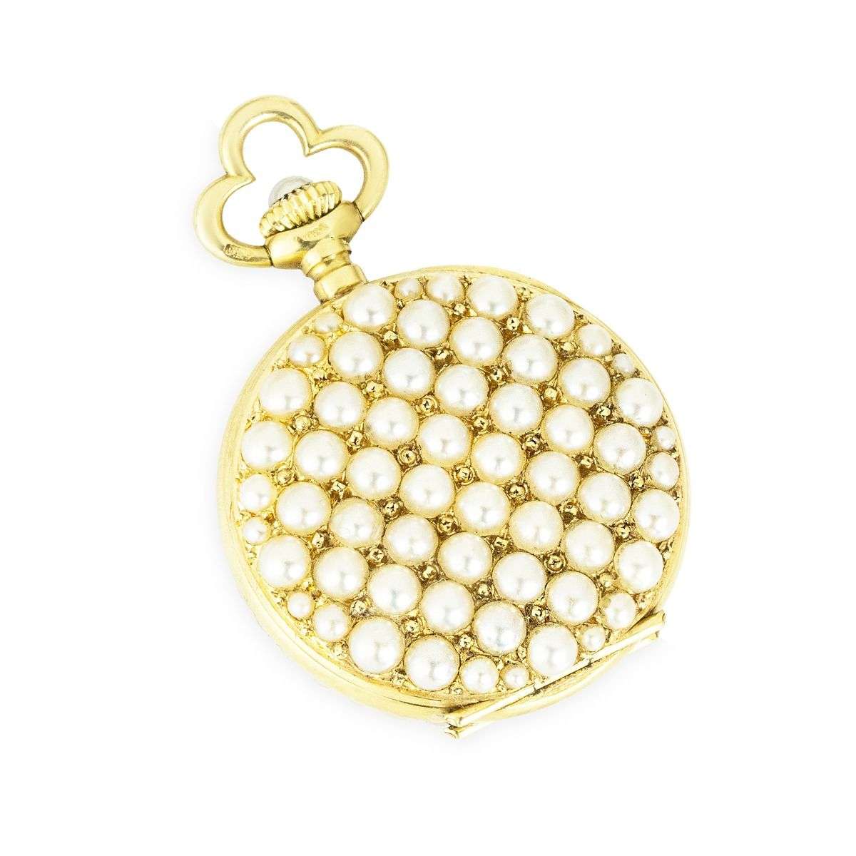 Case: The superb 18ct yellow gold case is set with fine half seed pearls to the front bezel. The back of the case is finely set with seed pearls. The winder is also set with a seed pearl. The inner cover is plain. The case is stamped PD, having Swiss hallmarks and being numbered aswell.