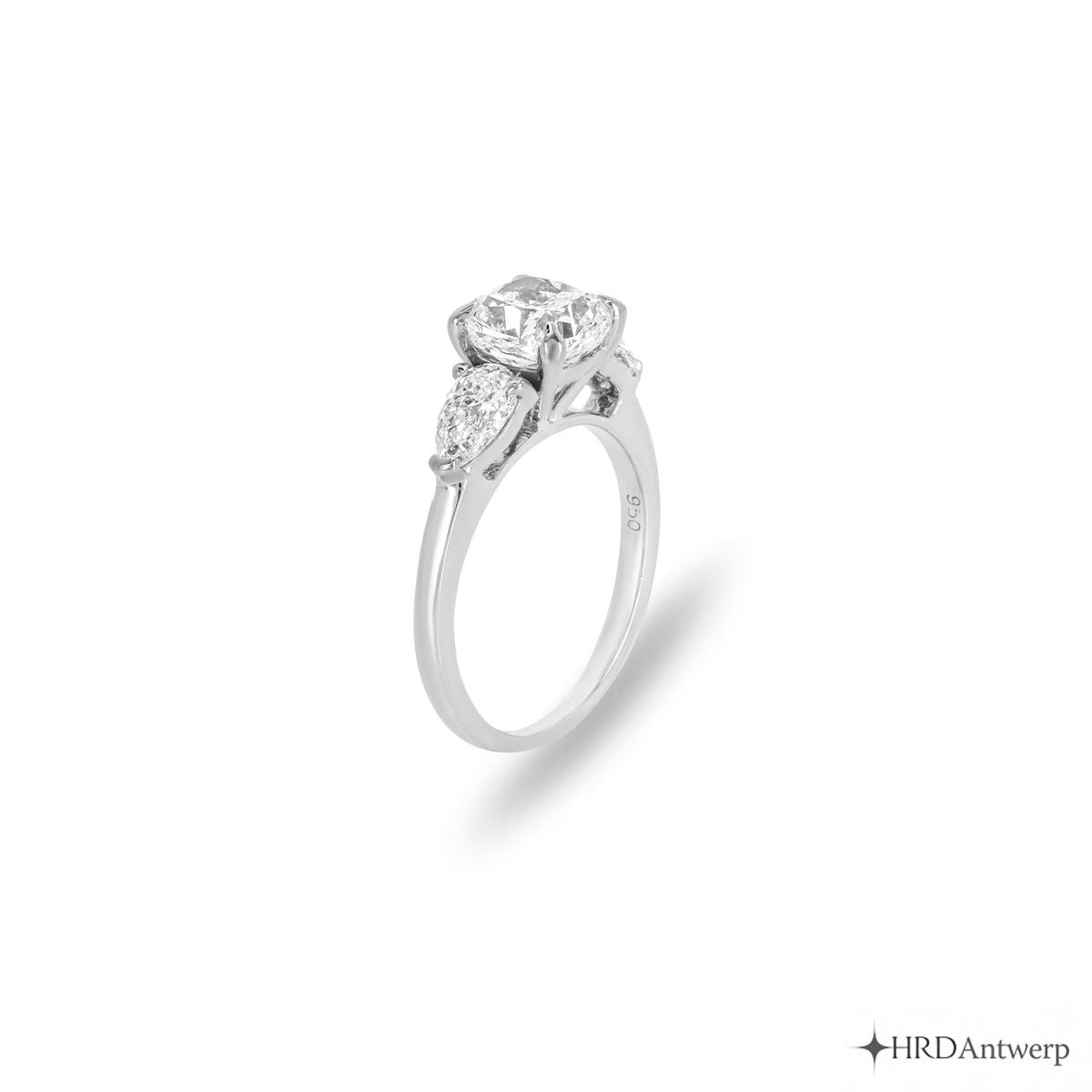 A gorgeous platinum diamond engagement ring. The three stone ring is set to the centre in a four prong mount, with a cushion cut diamond weighing 1.40ct, G colour and VS2 clarity. Flanked on either side of the centre stone is a single pear cut diamond in a three prong mount; one weighing 0.31ct, F colour and SI2 clarity and the other weighing 0.30ct, G colour and SI2 clarity. The 1.5mm ring has a gross weight of 3.41 grams and is currently a size H but can be adjusted for the perfect fit.