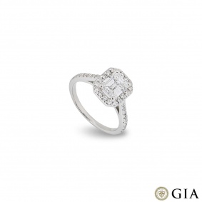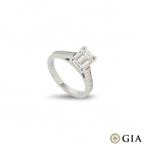 A stunning platinum diamond engagement ring. The solitaire features an emerald cut diamond set in a four prong mount weighing 1.51ct, E colour and VS2 clarity. The ring tapers from 1.5mm to 2.5mm, has a gross weight of 4.51 grams and is currently a size M½ but can be adjusted for the perfect fit.