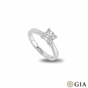 A platinum natural fancy yellow diamond solitaire ring. The engagement ring features a cushion cut diamond set to centre in a four claw mount weighing 1.03ct, fancy yellow colour with an even distribution and SI1 clarity. The ring measures 2mm in width, has a gross weight of 2.93 grams and is currently a size M but can be adjusted for a perfect fit.
