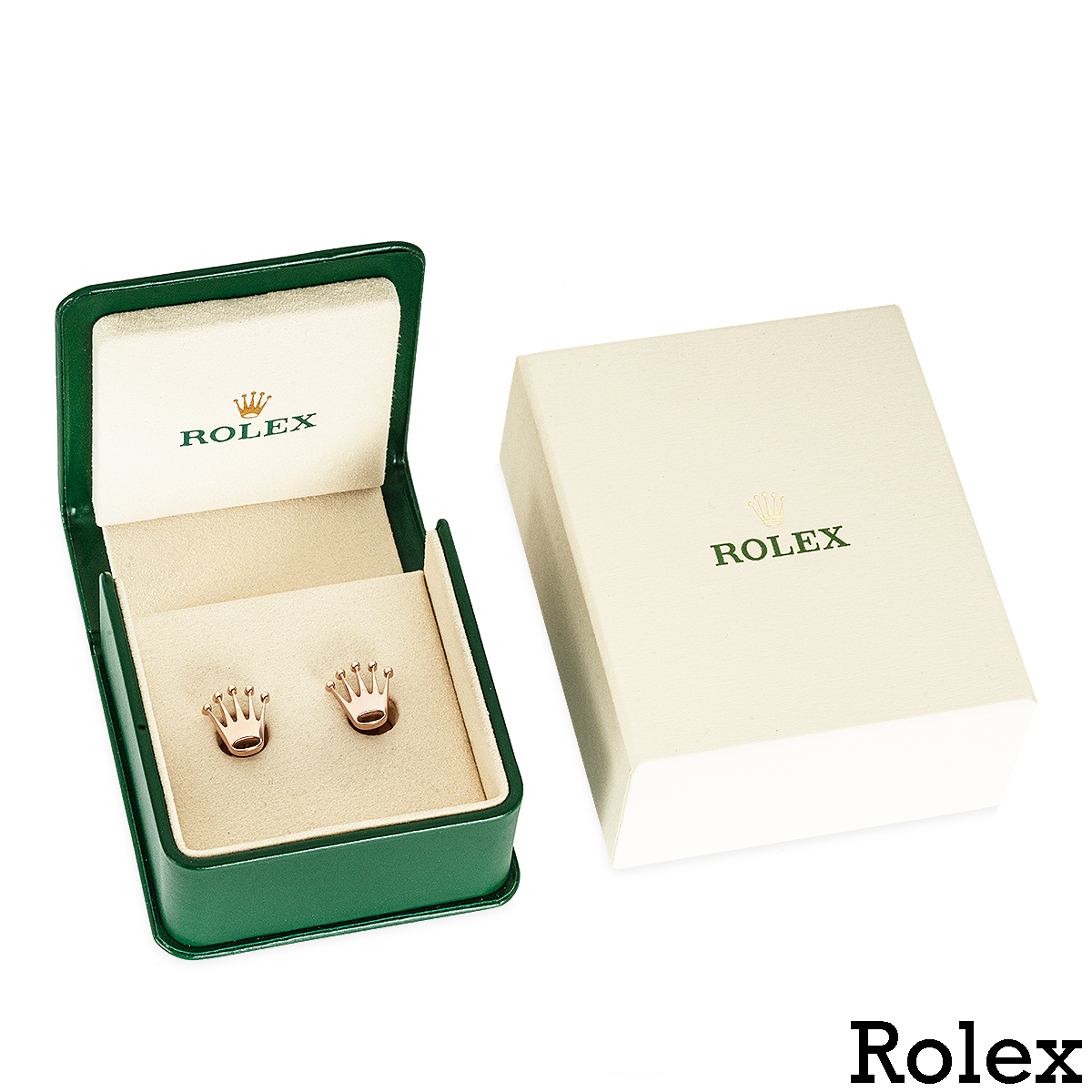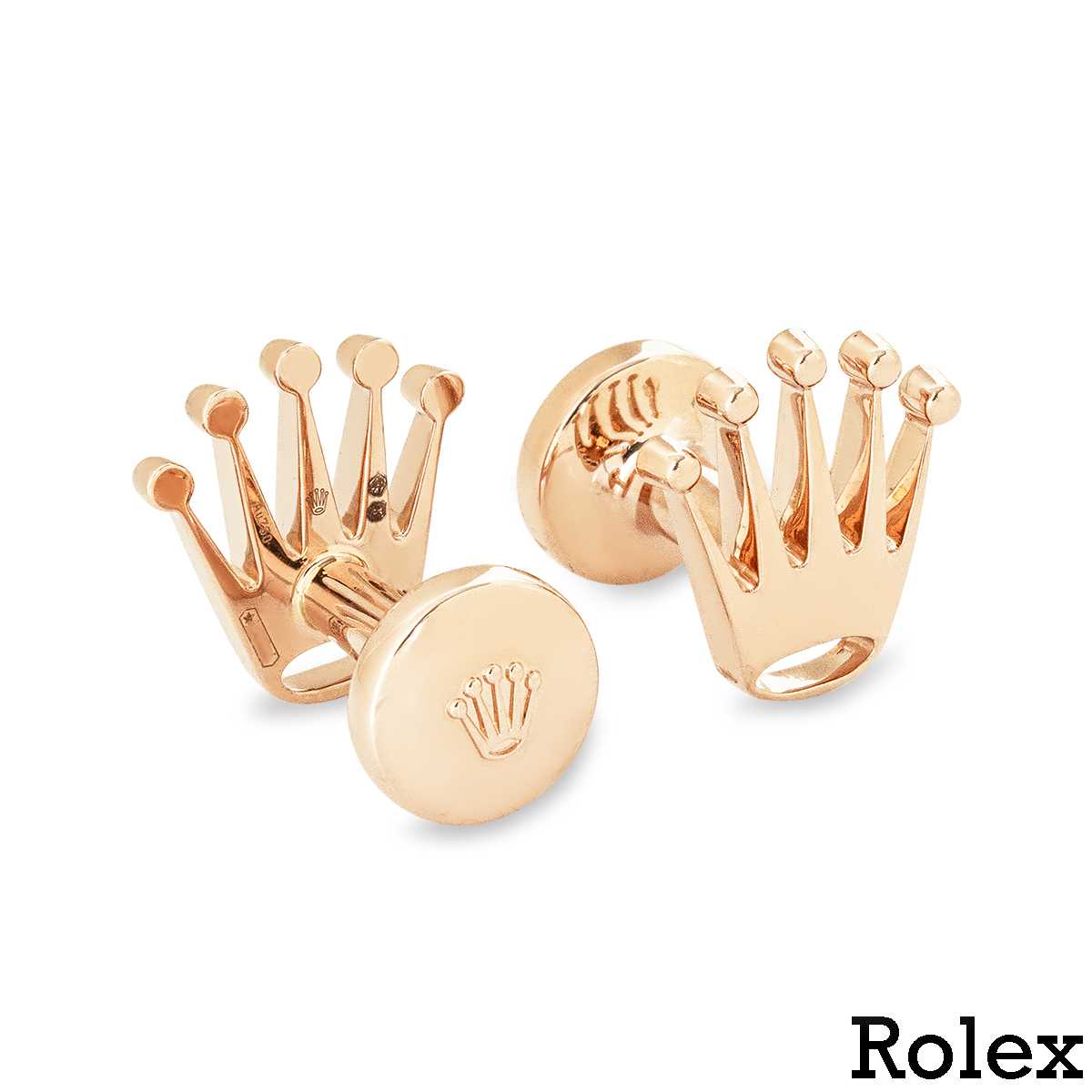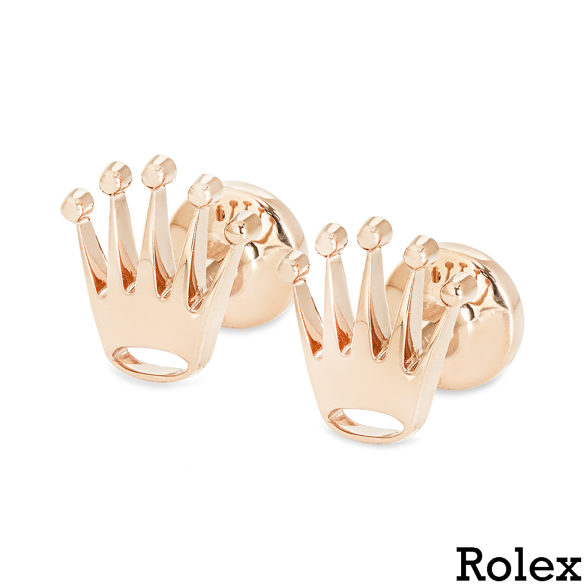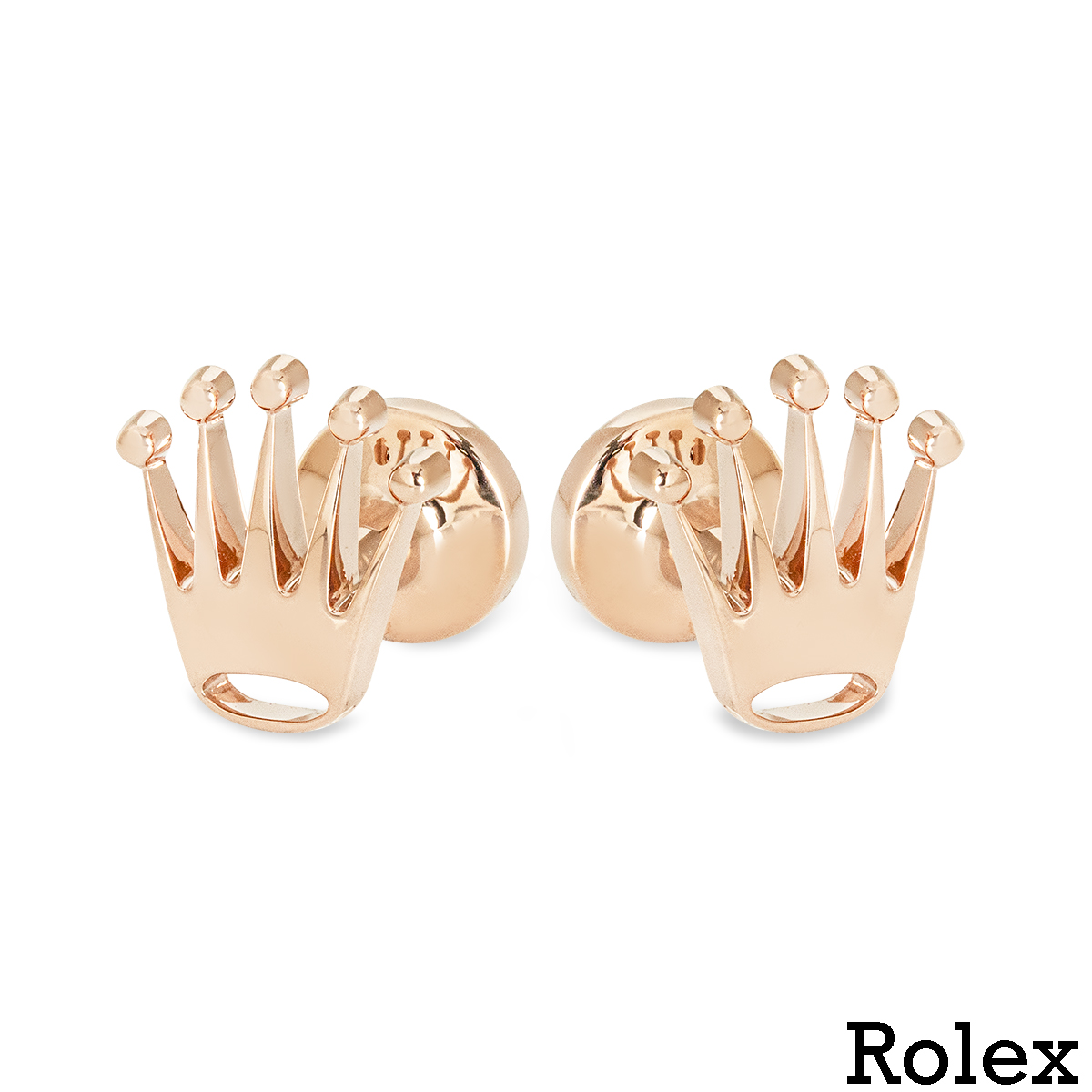 A pair of elegant 18k rose gold cufflinks by Rolex. Each cufflink comprises of a rose gold crown motif and a smaller rose gold disc with an embossed Rolex crown, joined together by an 18k rose gold bar.