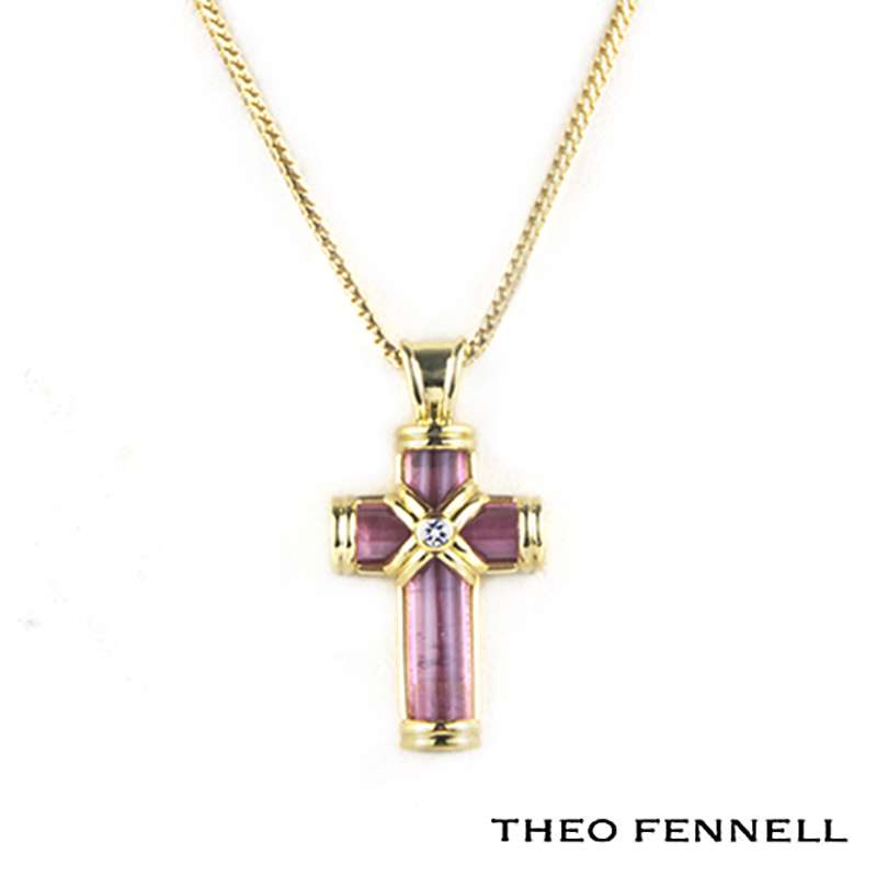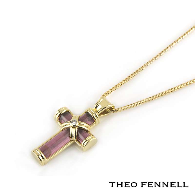 An amethyst and diamond set cross pendant by Theo Fennell. The pendant is formed as a polished amethyst cross with an 18k yellow gold border, set to the centre with a single round brilliant cut diamond. The pendant comes on an original Theo Fennel 18k yellow gold 18 inch chain.