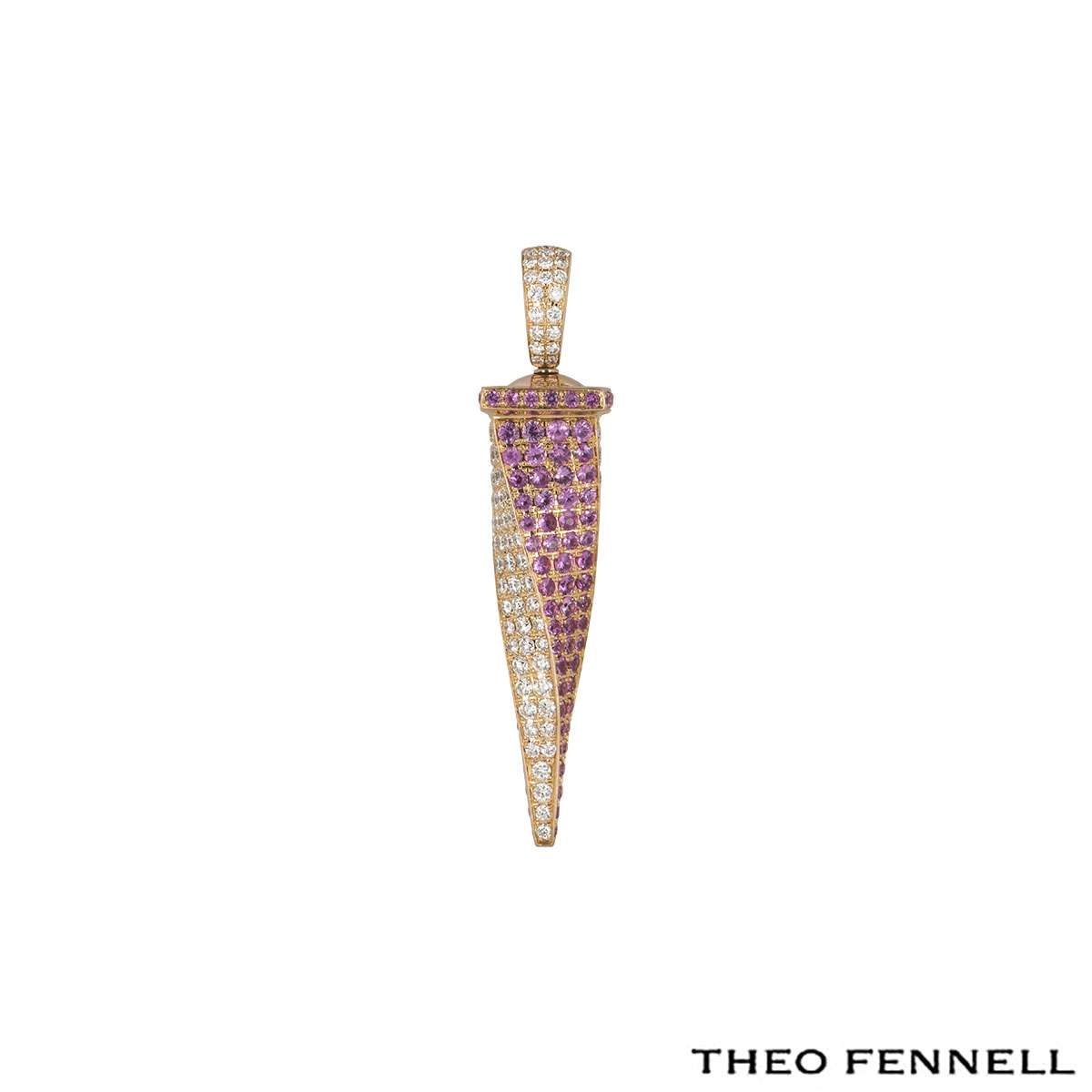 An 18k rose gold pendant by Theo Fennell. The pendant is in the style of a tooth and is set with round brilliant cut diamonds and pink sapphires. The diamonds have a total weight of approximately 0.84ct and the pink sapphires weigh approximately 0.87ct. The pendant measures 4.5cm in length and has a gross weight of 6.78 grams.