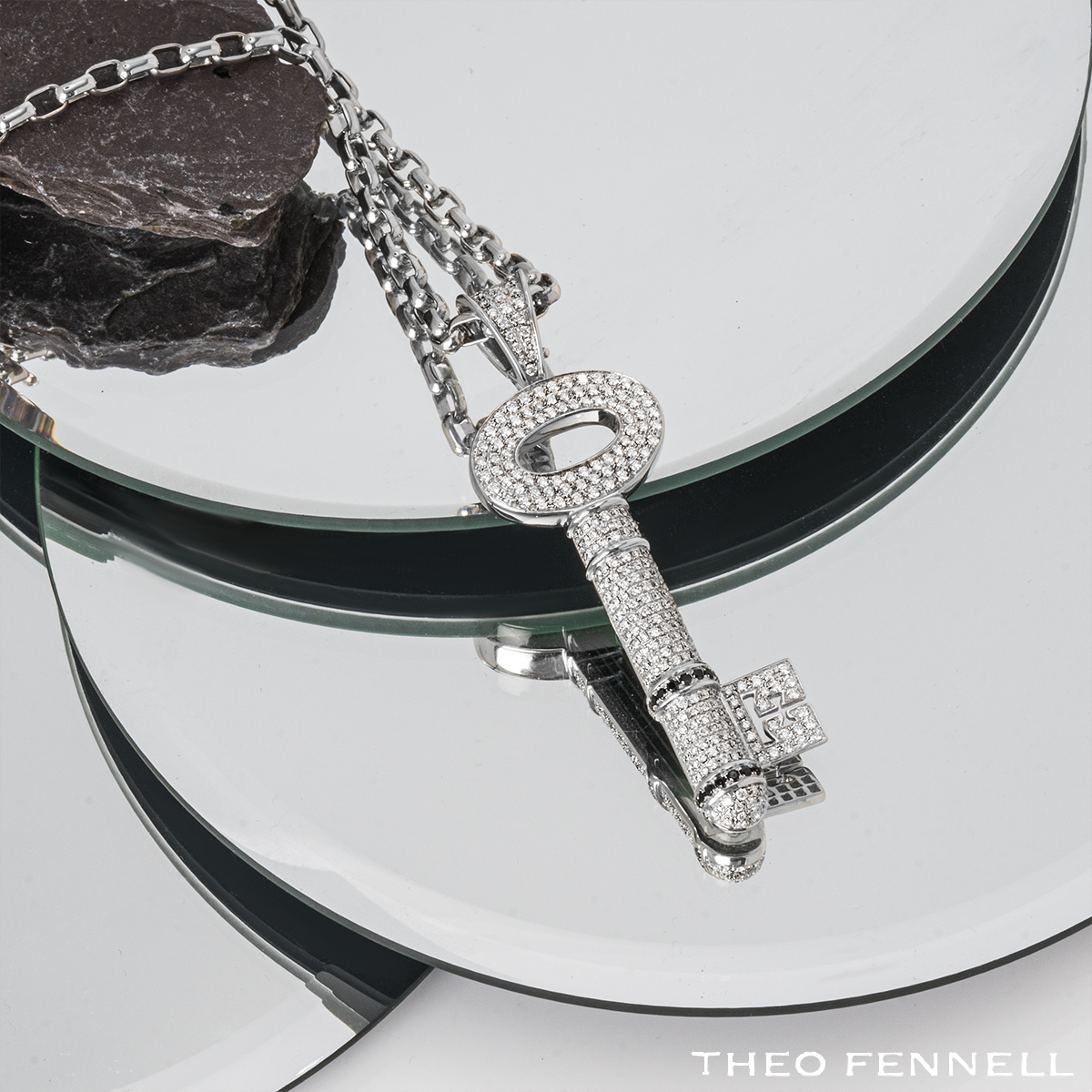 An outstanding 18k white gold diamond pendant by Theo Fennell. The pendant features a diamond set key motif pave set with 322 round brilliant cut diamonds with an approximate total weight of 1.45ct, F-G colour and VS-SI clarity. Further complementing the diamonds are 18 round cut black diamonds with an approximate weight of 0.13ct. The pendant measures 5.9cm in length, and 1.9cm in width and is suspended from a 15-inch link chain. The necklace finishes with a lobster clasp and has a gross weight of 31.62 grams.