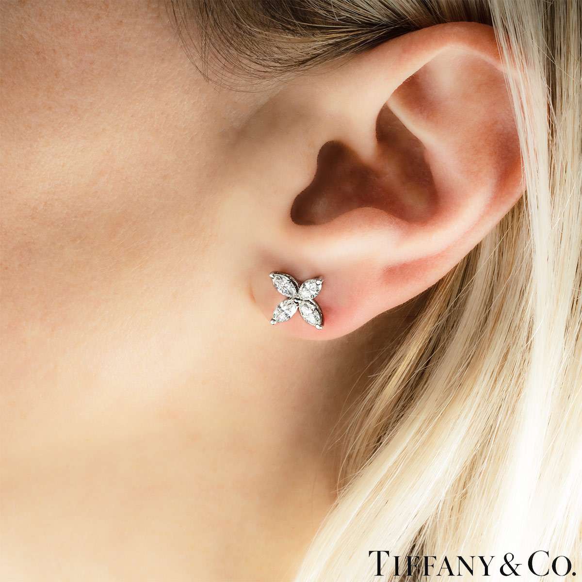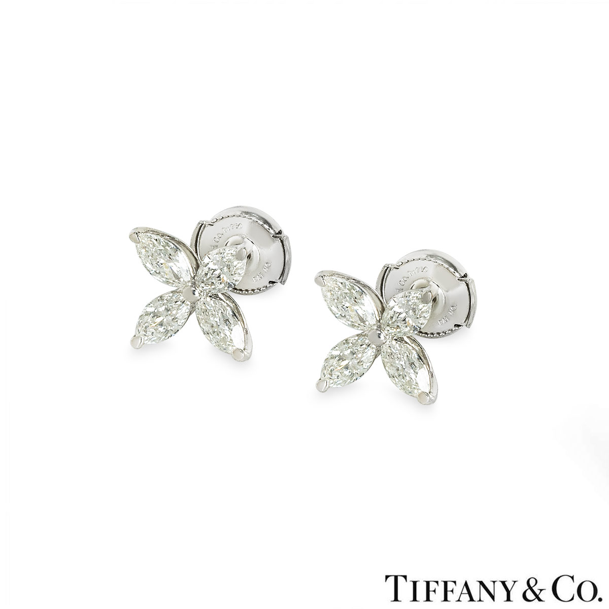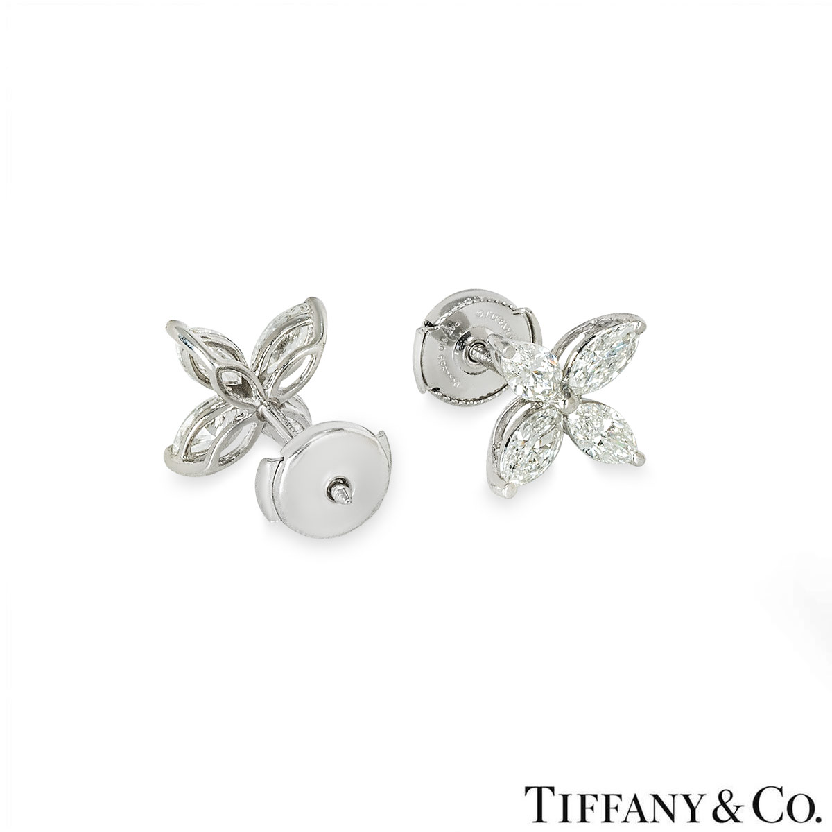 A pair of platinum earrings from the Victoria collection by Tiffany & Co. Each earring is set with 4 marquise cut diamonds in a claw setting. The earrings consist of 8 marquise cut diamonds with a total weight of approximately 1.62ct, D-G colour range and internally flawless to VS1 clarity range. The earrings are the large size model, they feature post and alpha back fittings and have a gross weight of 4.3 grams.