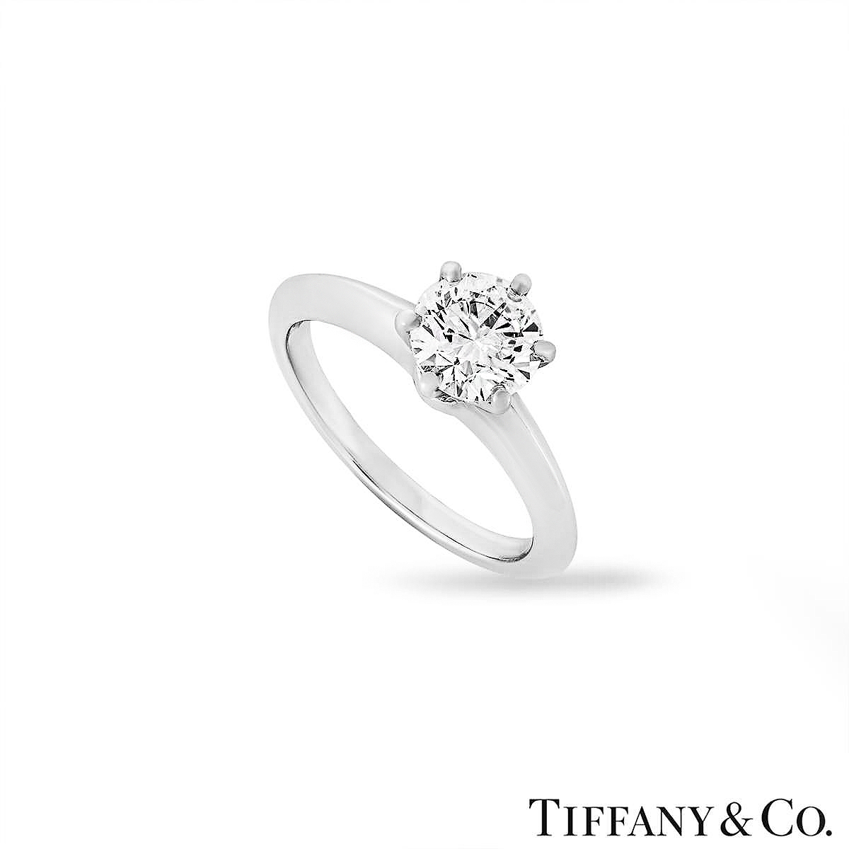 A classic platinum diamond ring by Tiffany & Co. from the Setting collection. The ring comprises of a round brilliant cut diamond in a platinum six claw setting with a weight of 1.08ct, H colour and VS2 clarity. The diamond scores an excellent rating in all three aspects for cut, polish and symmetry - this is known as a 'triple excellent' diamond. The ring is a size K½ but can be adjusted for a perfect fit and has a gross weight of 5.79 grams.