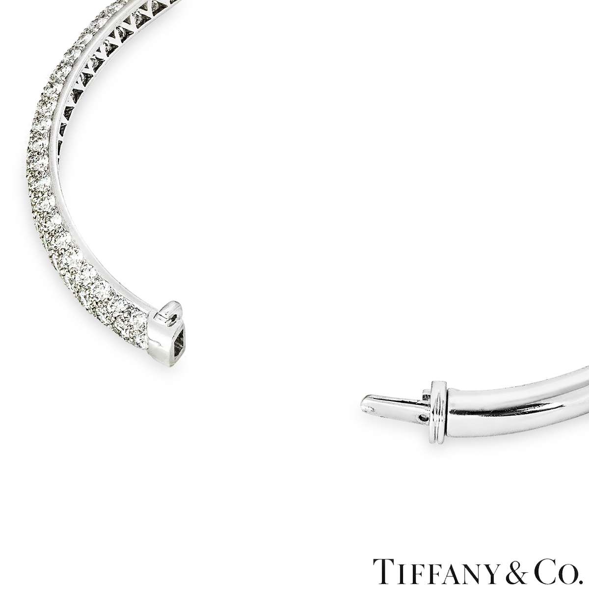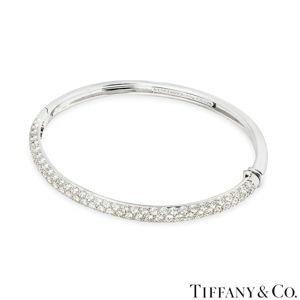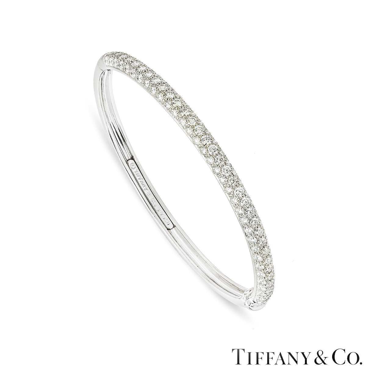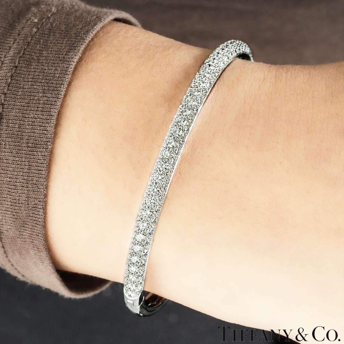 An elegant platinum and diamond hinged bangle from Tiffany & Co.’s Etoile collection. The bangle is set with three rows of pavé-set round brilliant-cut diamonds, with a total estimated weight of approximately 2.30 carats, all well matched in colour and clarity. Measuring 4.2mm in width, it is designed to fit a wrist size of up to 16cm and is secured with a hinged box clasp. The bangle has a gross weight of 25.5 grams.