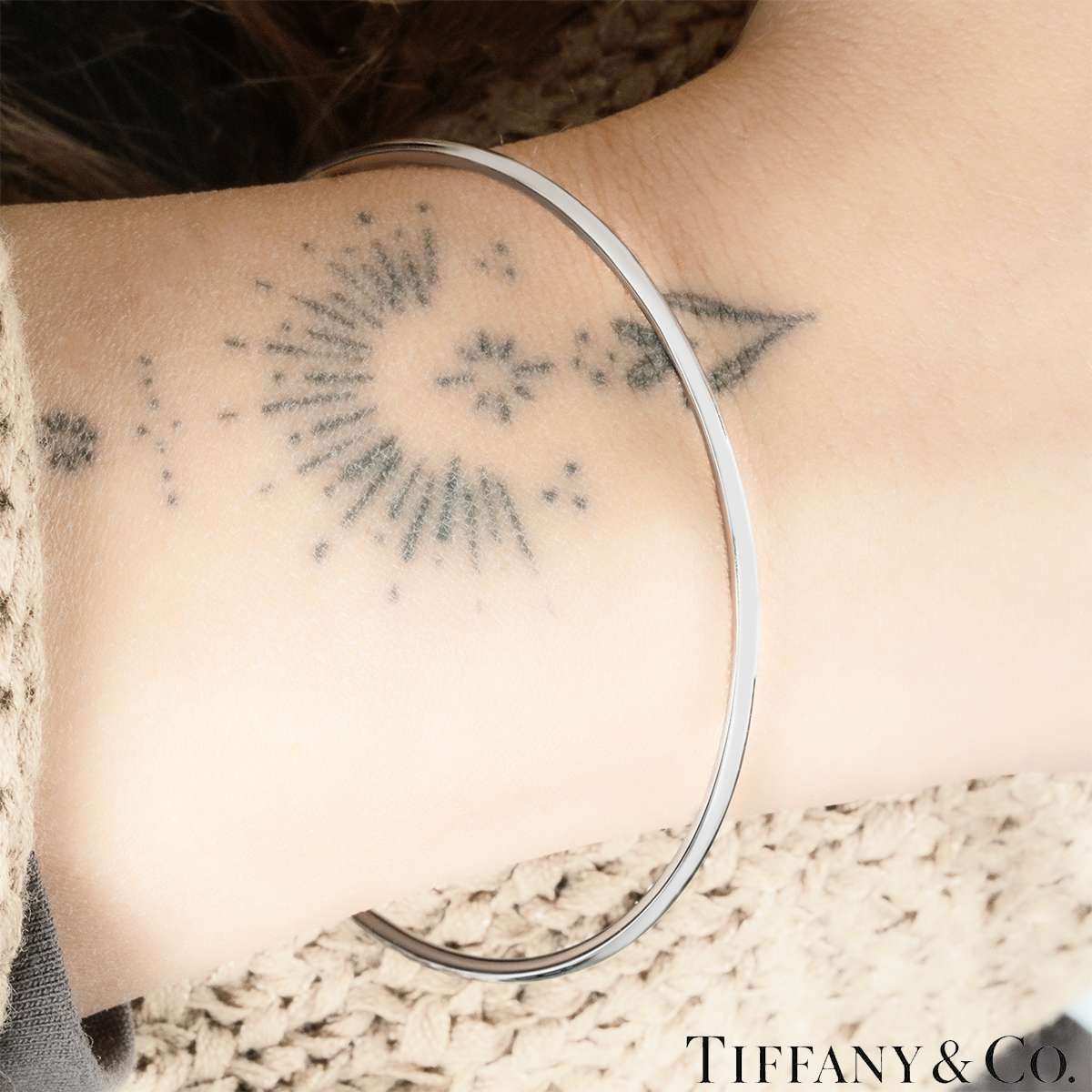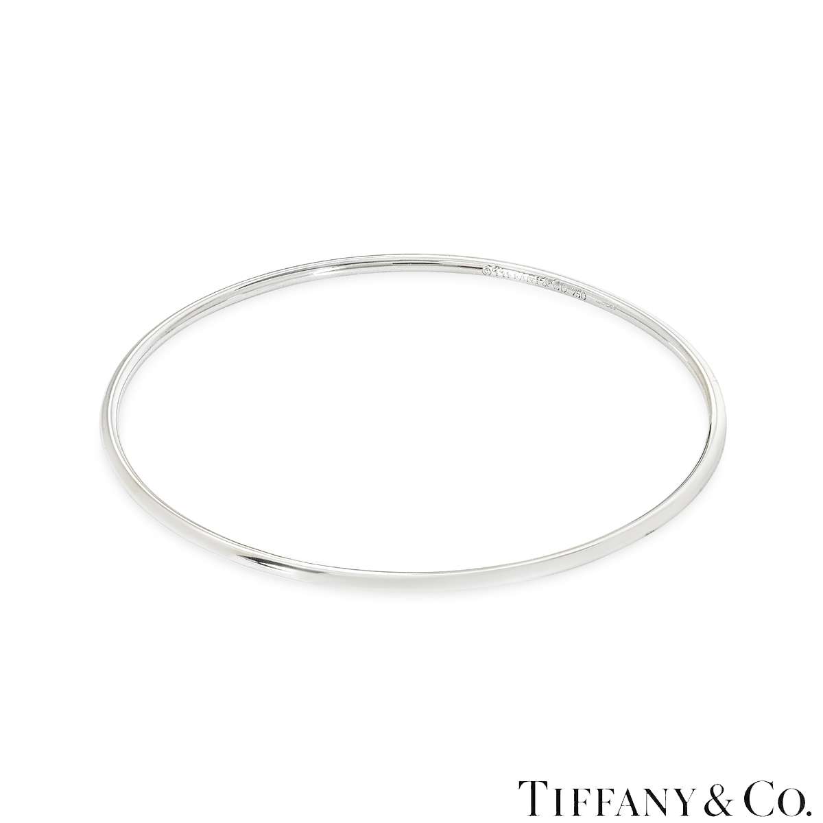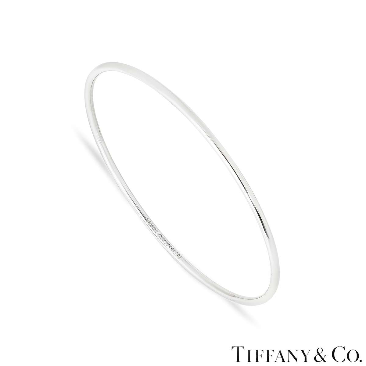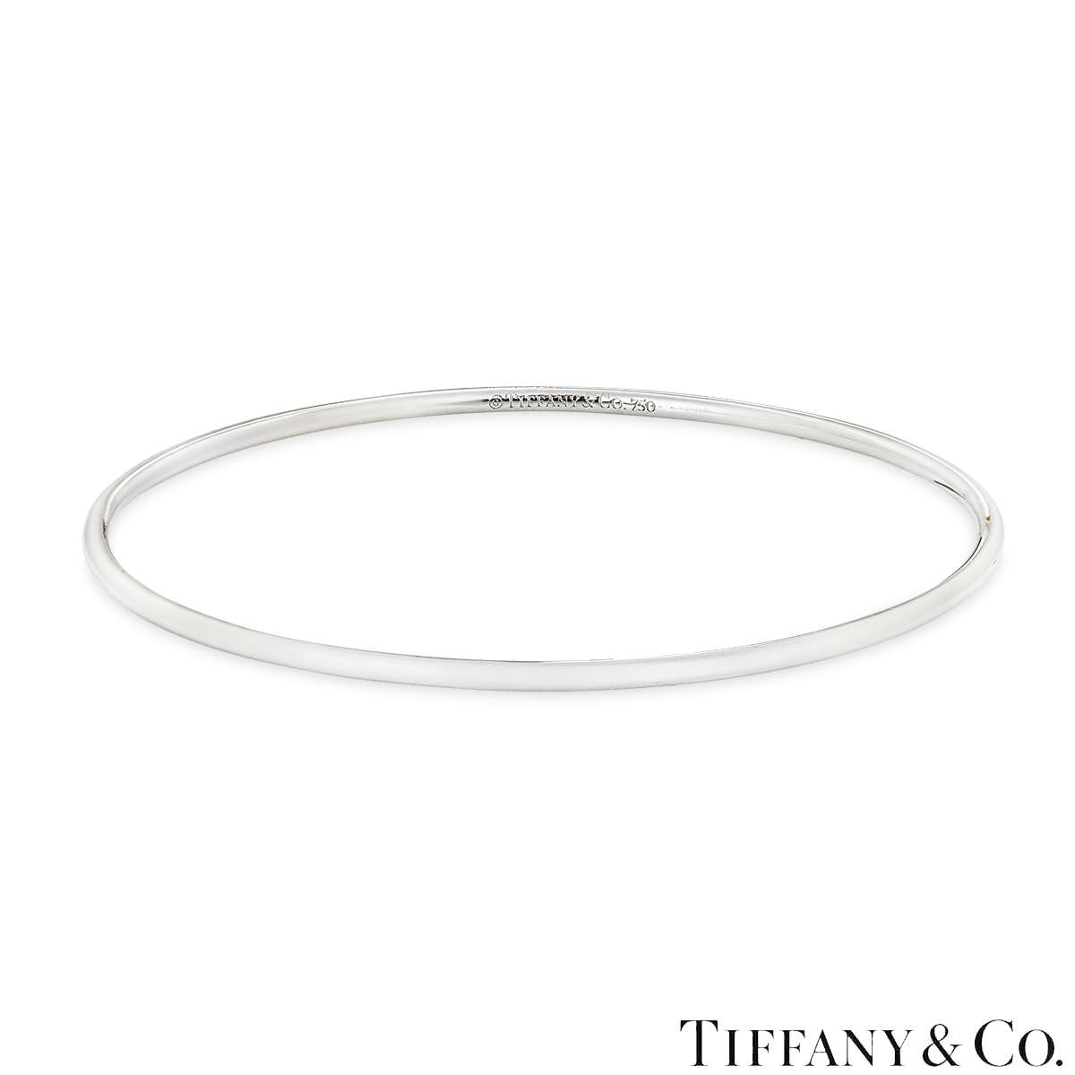 A stunning white gold wire bangle bracelet by Tiffany & Co. This bracelet is 2mm in width, with a diameter of 6cm. It is best suited for wrist sizes of around 16cm and has a gross weight of 8.5 grams.
