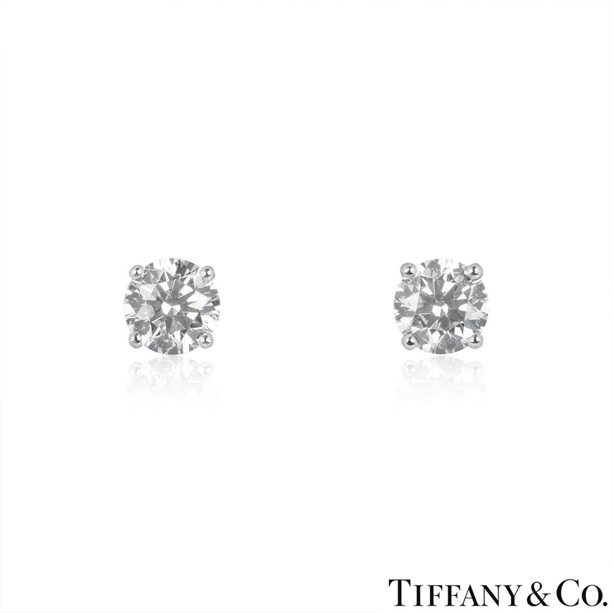 A pair of diamond stud earrings by Tiffany & Co. The earrings each feature a single round brilliant cut diamond in a 4 claw setting weighing 1.21ct and 1.22ct. The diamonds are both G colour and VS1 clarity. The earrings have post and alpha back fittings and a gross weight of 4.1 grams.