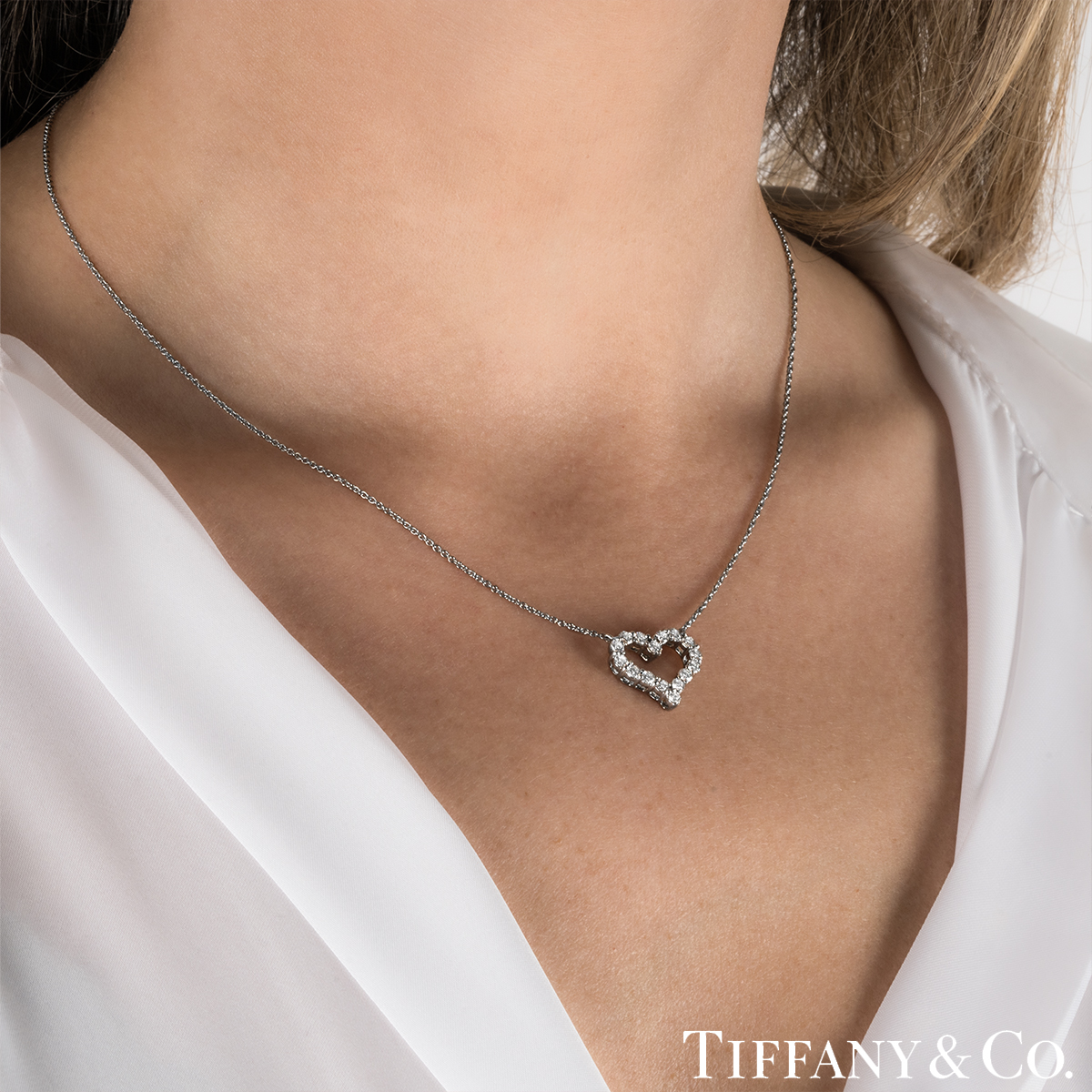 A charming platinum diamond pendant by Tiffany & Co. from the Tiffany Hearts collection. The pendant features an open heart design pave set with 16 round brilliant cut diamonds with an approximate total weight of 0.54ct, predominately F colour and VS clarity. Suspending from a 16-inch chain, the size small pendant measures 16mm wide, finishes with a spring ring clasp and has a gross weight of 4.68 grams.
