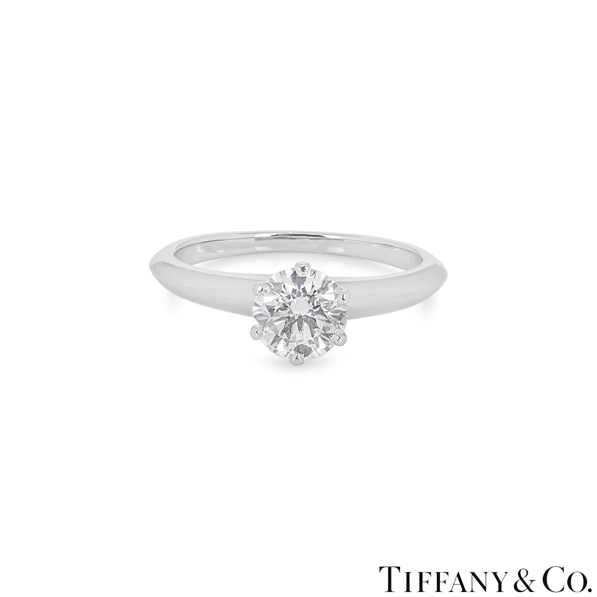 A stunning platinum diamond ring by Tiffany & Co. from The Tiffany Setting collection. The ring comprises of a round brilliant cut diamond in a classic 6 claw setting with a weight of 0.79ct, F colour and IF clarity. The ring has a gross weight of 4.09 grams and is currently a size K but can be adjusted for a perfect fit.