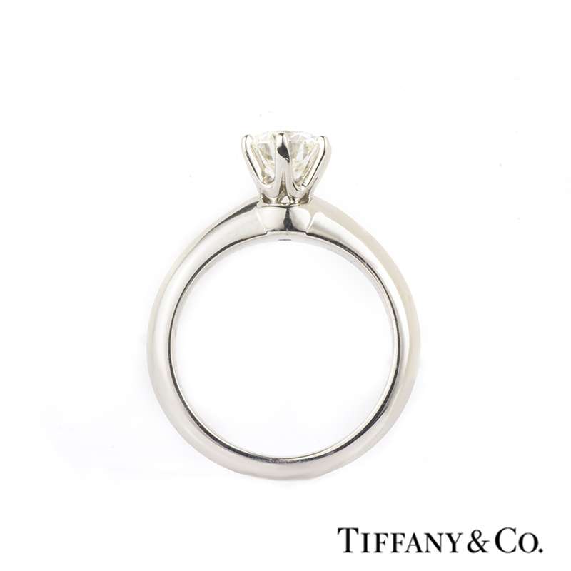 An elegant Tiffany & Co. single stone ring in platinum. The round brilliant cut diamond weighs 0.91ct, the colour is I and the clarity is SI1 and has an excellent cut, polish and symmetery grade. The band has a knife edge and is 2mm thick. The ring is currently a size J but can be adjusted for the perfect fit and the gross weight is 6.07 grams.