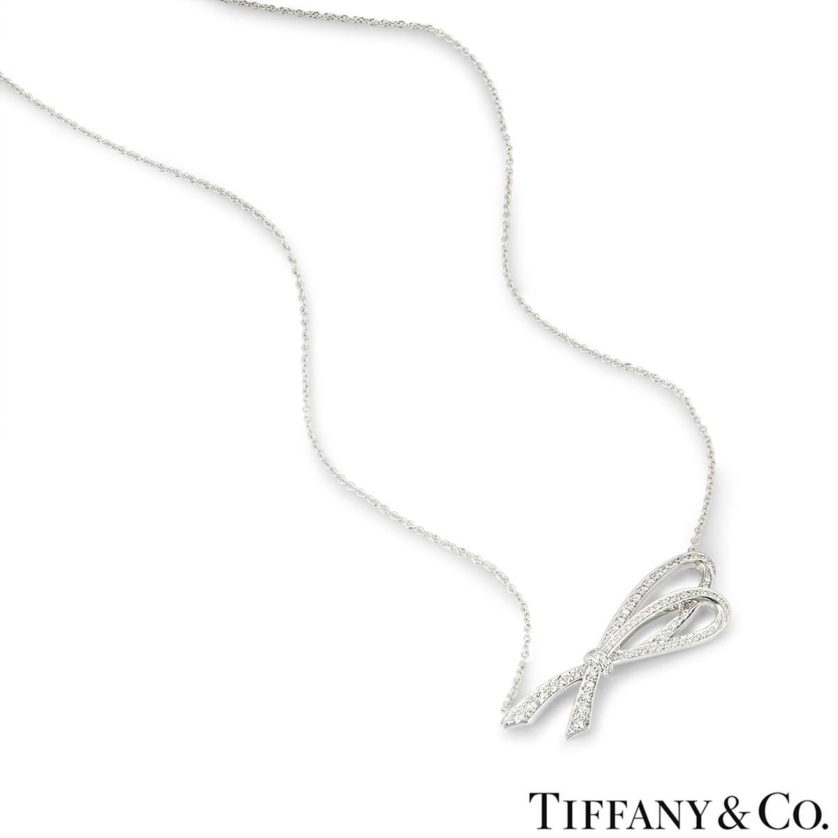An 18k white gold diamond Bow necklace by Tiffany & Co. The openwork bow motif is set with round brilliant cut diamonds totalling approximately 0.40ct. The bow measures 4cm in width and comes on an original 16 inch chain. The necklace has a gross weight of 5.9 grams.