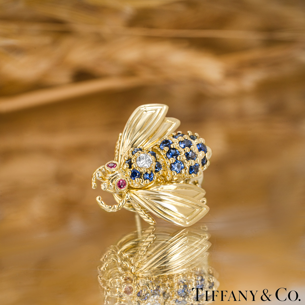 A charming pair of 18k yellow gold diamond, sapphire and ruby bee earrings by Tiffany & Co. The earrings each feature a bee motif set to the top of the body with a single round brilliant cut diamond, 16 round cut sapphires set throughout the body and 2 round cut ruby eyes in a rubover setting. The diamonds have an approximate total weight of 0.10ct F-G colour and VS clarity, the sapphires have an approximate total weight of 0.80ct and the rubies have an approximate total weight of 0.06ct. The earrings measure 17mm in height and 19mm in width, finish with omega back fittings and have a gross weight of 11.52 grams.