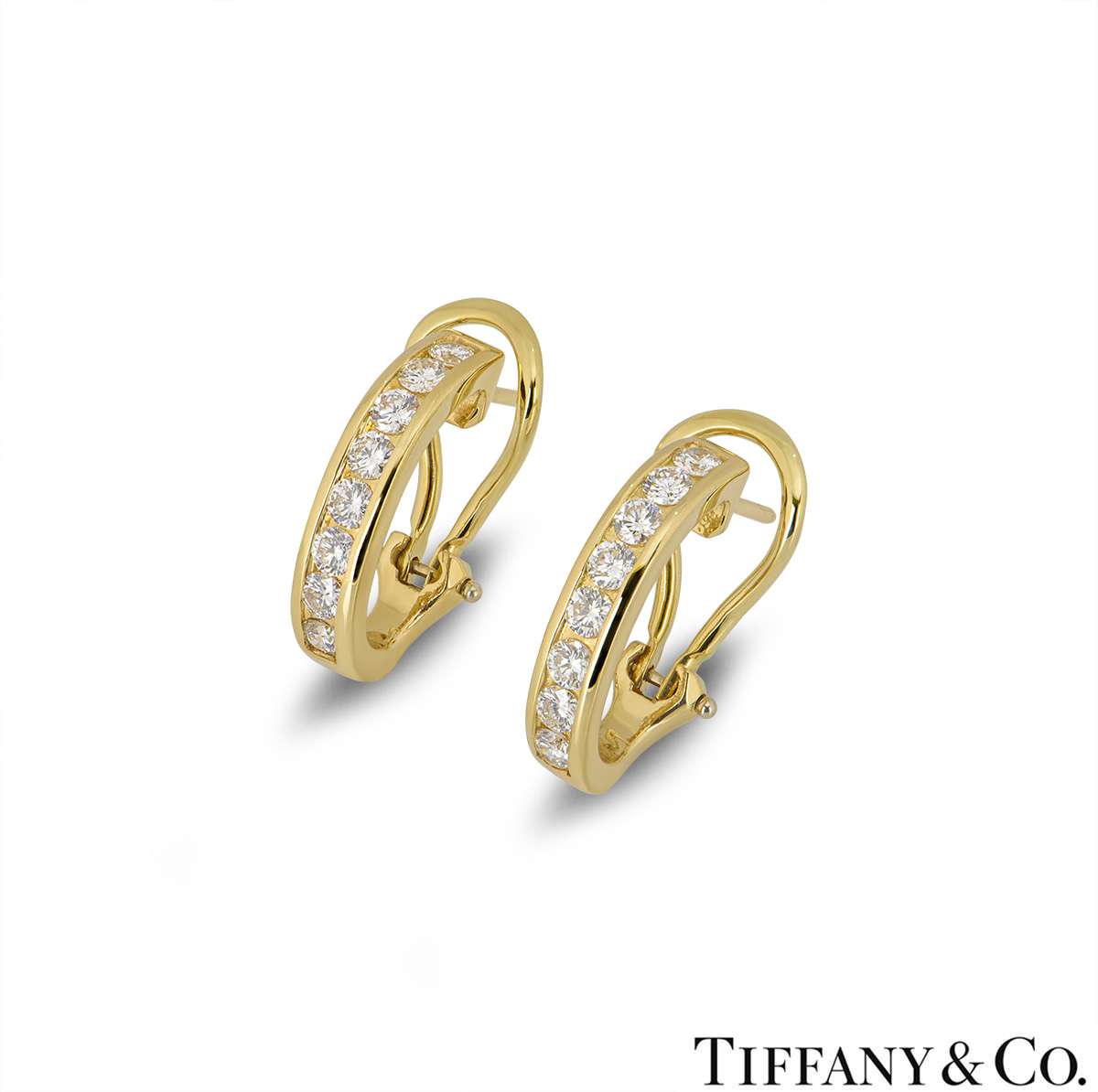 A beautiful pair of diamond set hoop earrings by Tiffany & Co. The hoops are channel set with 8 diamonds in each hoop and totals to approximately 0.96ct. The earrings feature post and clip fittings and measure 18mm in height and 3.7mm in width and have a gross weight of 6.3 grams.