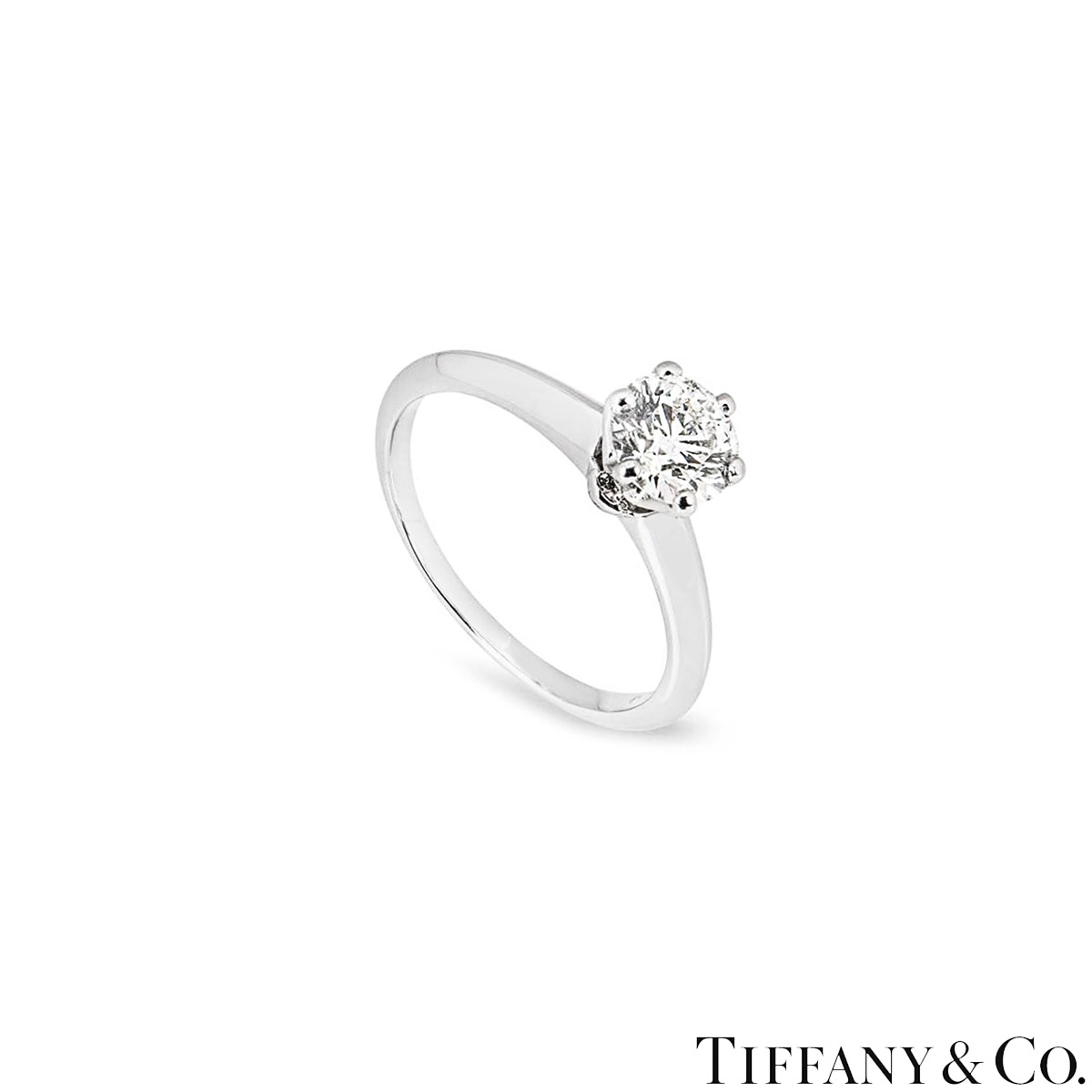 A beautiful platinum diamond ring by Tiffany & Co. from the Setting collection. The ring comprises of a round brilliant cut diamond in a 6 claw setting with a weight of 1.10ct, I colour and VVS2 clarity. The diamond scores an excellent rating in all three aspects for cut, polish and symmetry - this is known as a 'triple excellent' diamond. The ring is a size J½ but can be adjusted for a perfect fit and has a gross weight of 4.18 grams.