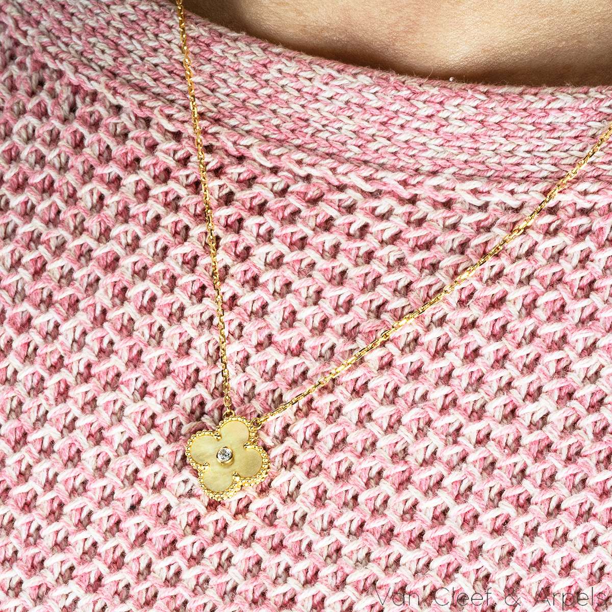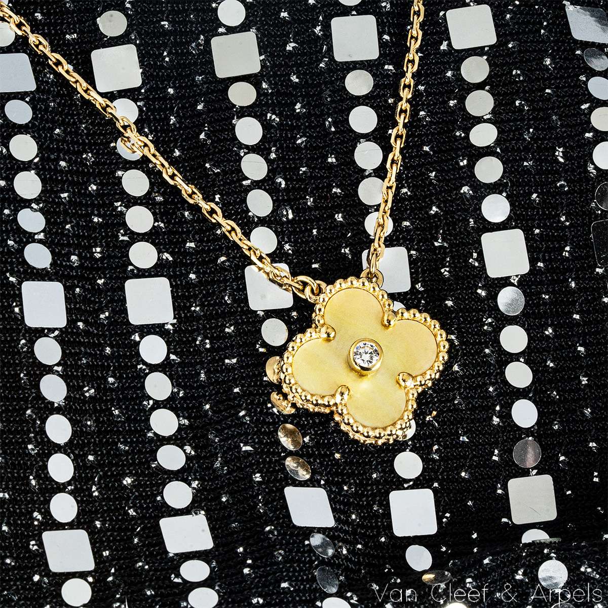 A limited edition 18k yellow gold mother of pearl and diamond Van Cleef & Arpels Vintage Alhambra pendant from the 2018 Holiday collection. The pendant features a beaded edge 4 leaf clover motif with a light green Celadon Sèvres porcelain inlay. Further complementing the inlay is a single bezel set round brilliant cut diamond, weighing approximately 0.05ct. The iconic motif measures 1.5cm in width and suspends from an adjustable 14-16 inch chain. Finishes with a lobster clasp and has a total gross weight of 6.6 grams.