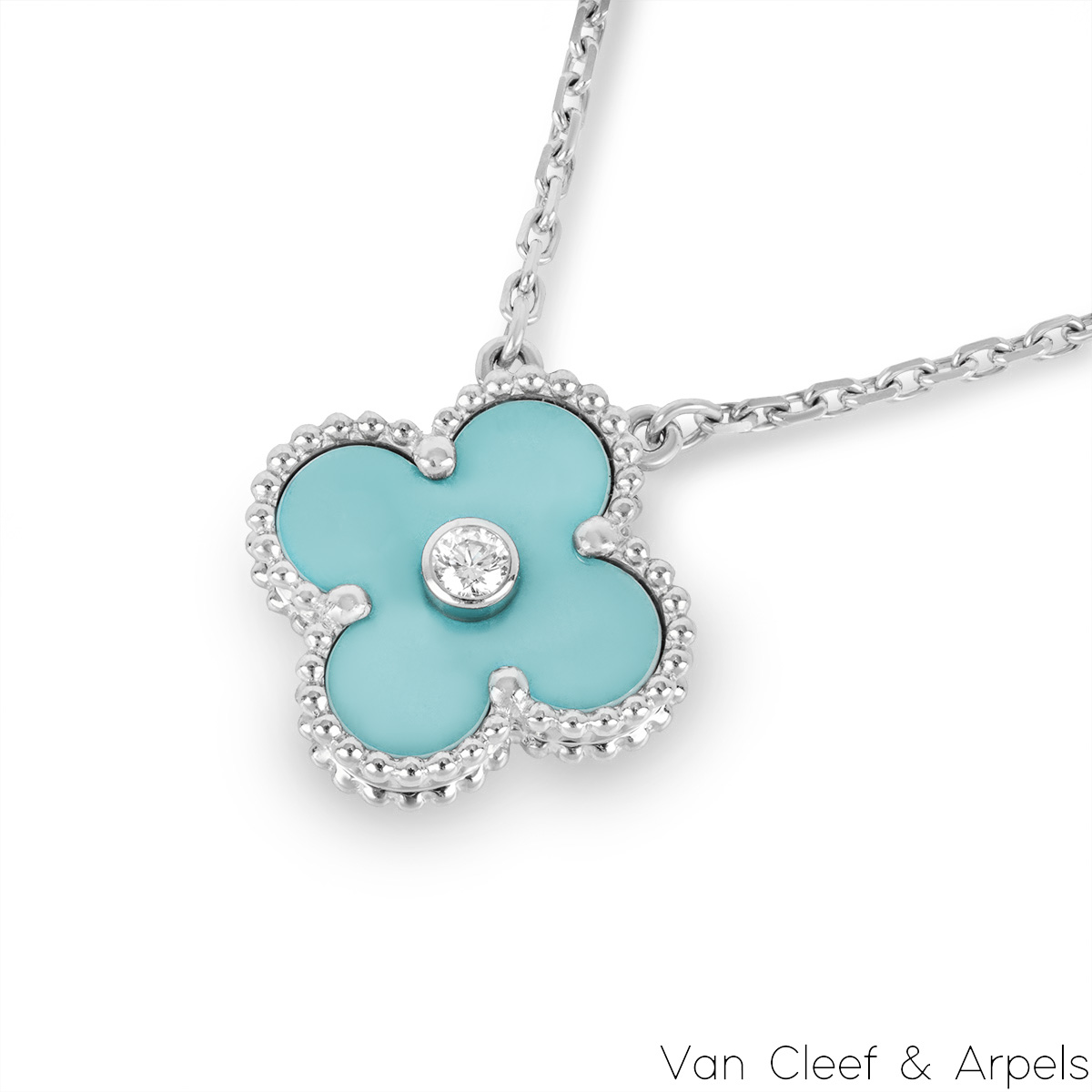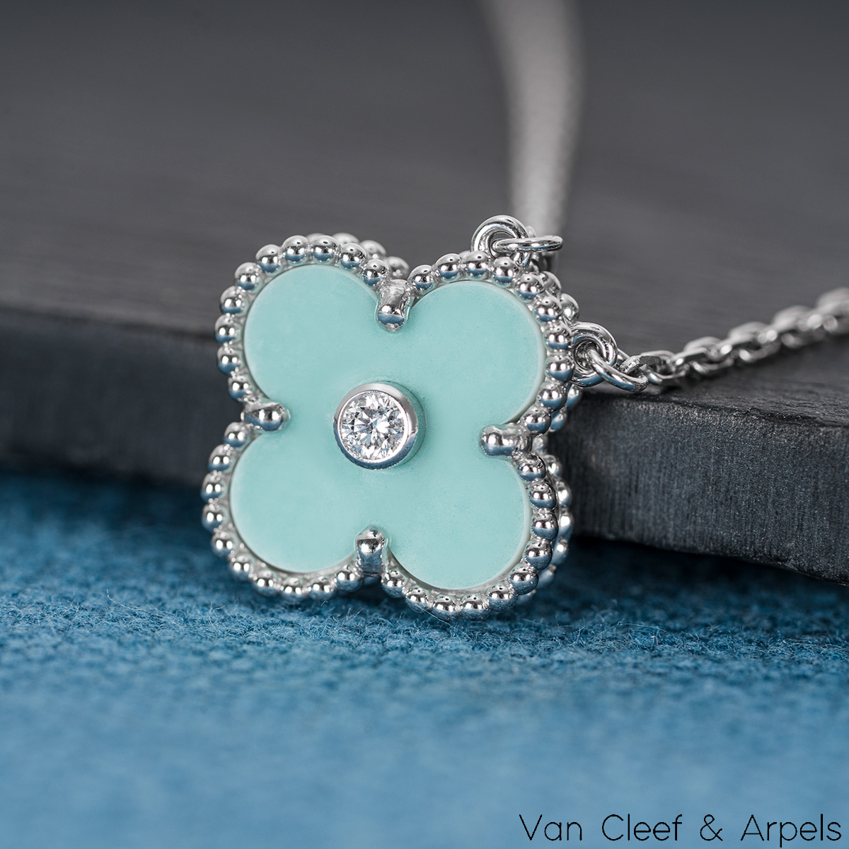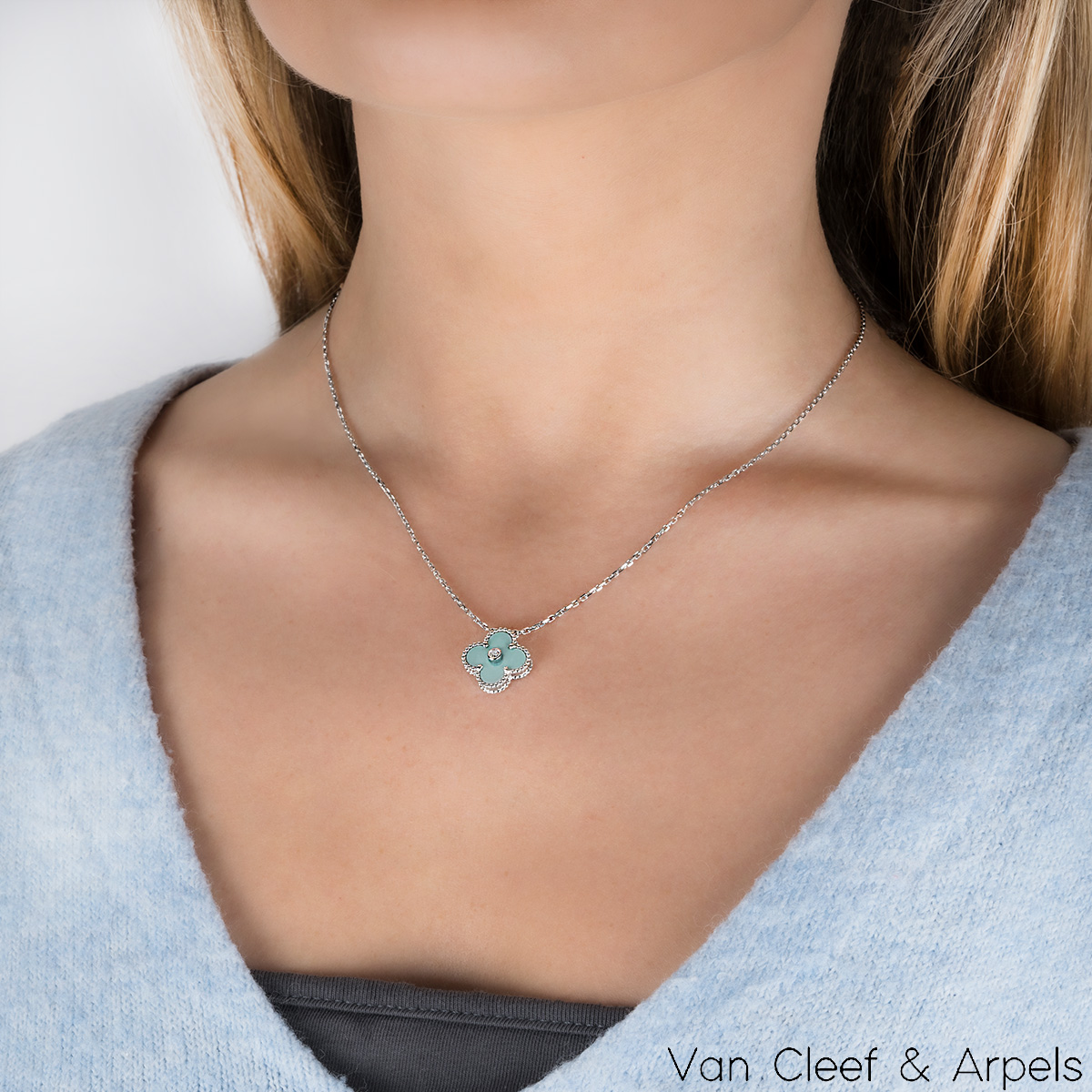 A limited edition 18k white gold light green Celadon Sèvres porcelain and diamond Van Cleef & Arpels Vintage Alhambra pendant from the 2022 Holiday collection. The pendant features a beaded edge 4 leaf clover motif with a light green Celadon Sèvres porcelain inlay. Further complementing the inlay is a single bezel set round brilliant cut diamond, weighing approximately 0.05ct. The iconic motif measures 1.5cm in width and suspends from an adjustable 14-16 inch chain. Finishes with a lobster clasp and has a total gross weight of 7.0 grams.