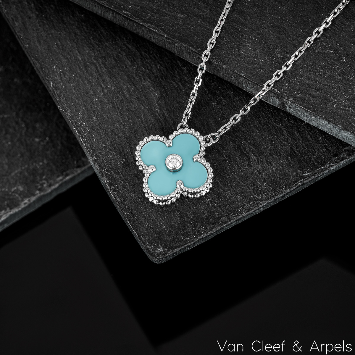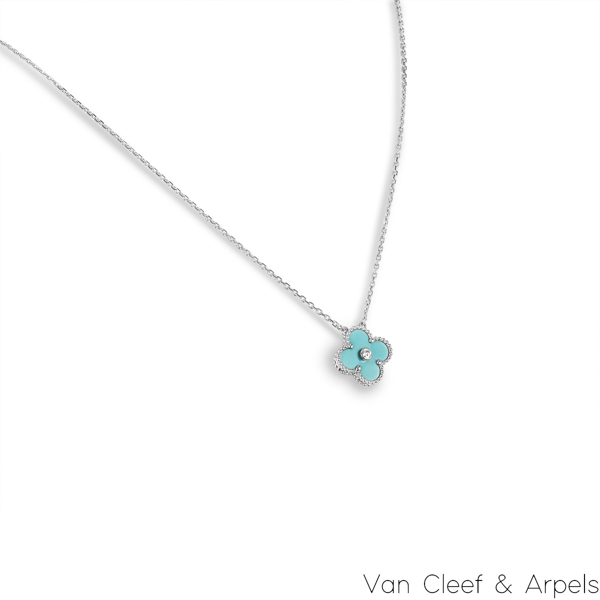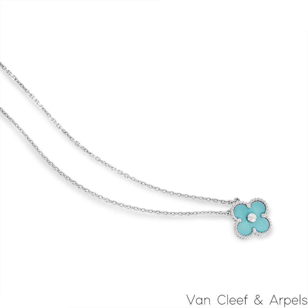 A limited edition 18k white gold light green Celadon Sèvres porcelain and diamond Van Cleef & Arpels Vintage Alhambra pendant from the 2022 Holiday collection. The pendant features a beaded edge 4 leaf clover motif with a light green Celadon Sèvres porcelain inlay. Further complementing the inlay is a single bezel set round brilliant cut diamond, weighing approximately 0.05ct. The iconic motif measures 1.5cm in width and suspends from an adjustable 14-16 inch chain. Finishes with a lobster clasp and has a total gross weight of 7.0 grams.