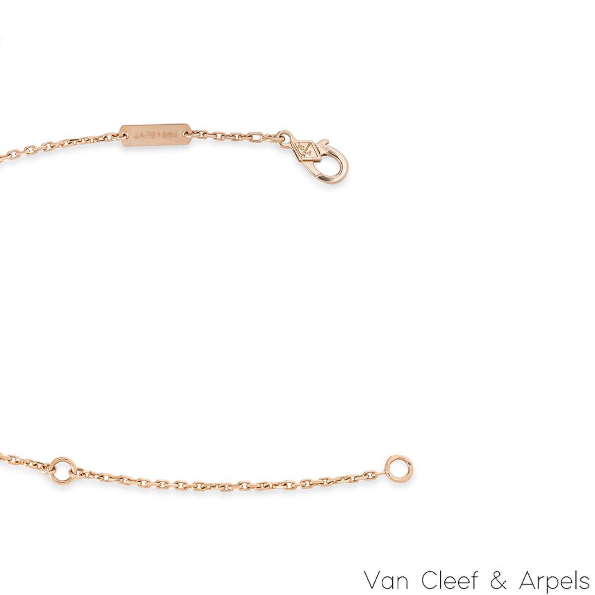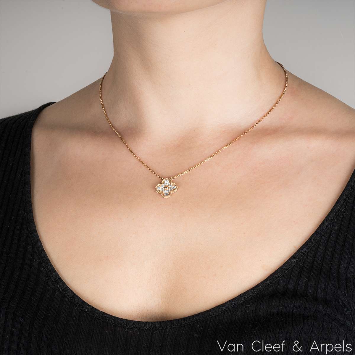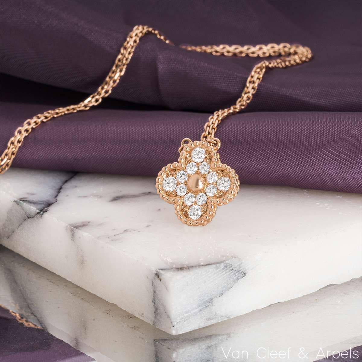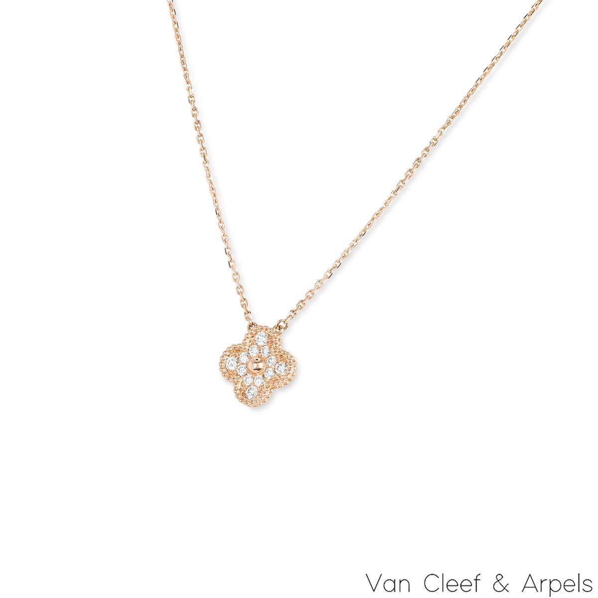 A stunning 18k rose gold diamond Van Cleef & Arpels pendant from the Vintage Alhambra collection. The pendant features a beaded edge 4-leaf clover motif with 12 round brilliant cut diamonds pave set with an approximate total weight of 0.48ct. The iconic motif measures 1.5cm in width and suspends from an adjustable 14-16 inch chain. The pendant finishes with the hallmark lobster clasp and has a gross weight of 4.7 grams.