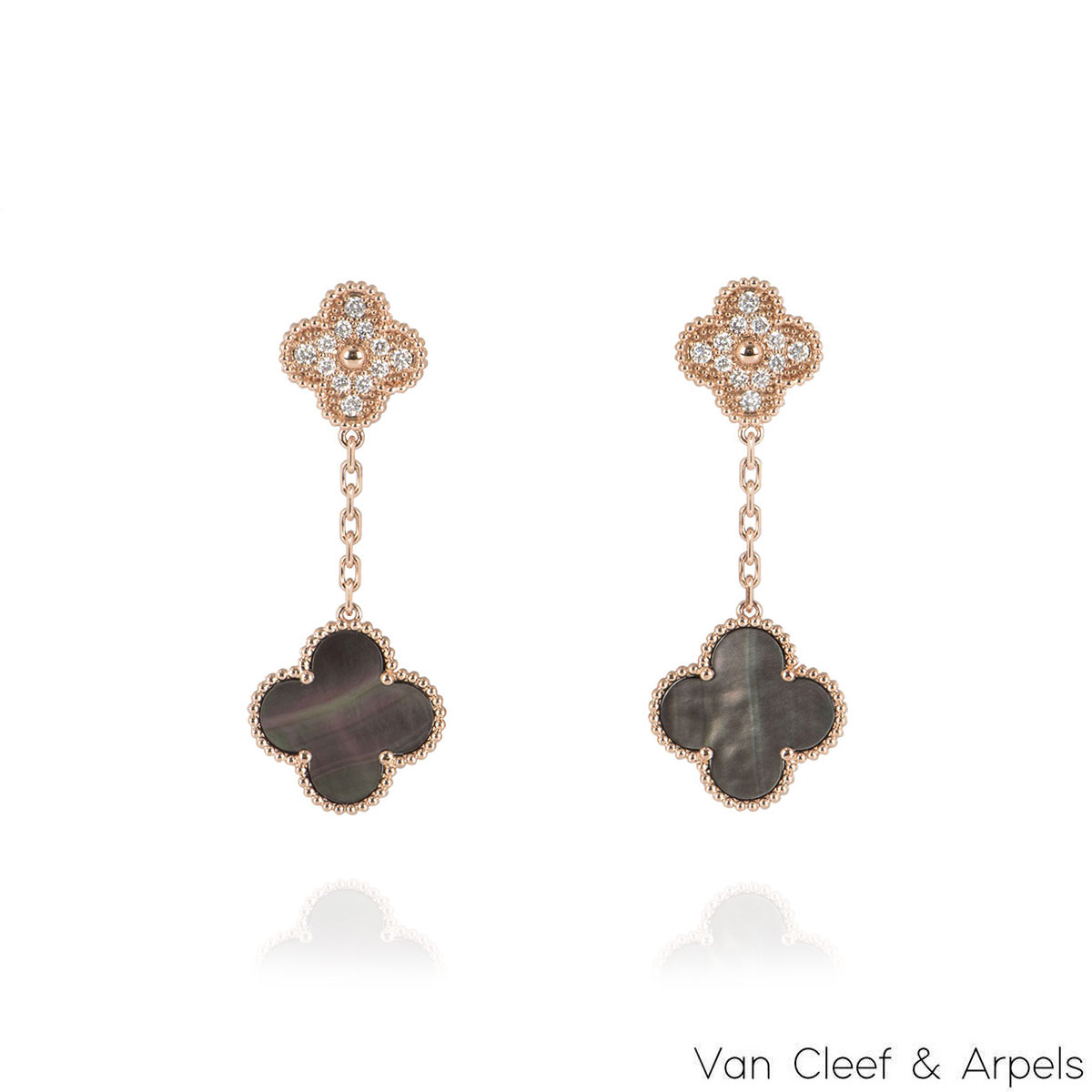 A beautiful pair of 18k rose gold Van Cleef & Arpels earrings from the Vintage Alhambra collection. The earrings feature the iconic 4-leaf clover motif, complemented by a beaded edge. The 1.5cm wide earrings feature a clip backing with detachable stem and have a gross weight of 9.7 grams.
