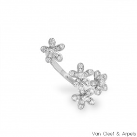 A gorgeous 18k white gold diamond pendant by Van Cleef & Arpels from the Frivole collection. The pendant features three diamond set heart shaped petals with a singular diamond in the centre. The 43 round brilliant cut diamonds have an approximate total weight of 0.81ct, D-F colour and VVS-VS clarity. The small model pendant suspends from an adjustable 14-16 inch chain, finishes with a lobster clasp and has a gross weight of 5.61 grams.