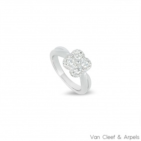 An exquisite 18k white gold diamond between the finger ring by Van Cleef & Arpels from the Socrate collection. The ring comprises of 3 diamond set floral motifs on one side and 1 diamond set floral motif on the other. The 44 round brilliant cut diamonds have an approximate total weight of 0.88ct, D-F colour and IF-VVS clarity. The 2mm wide ring is a size 53 and has a gross weight of 6.58 grams.