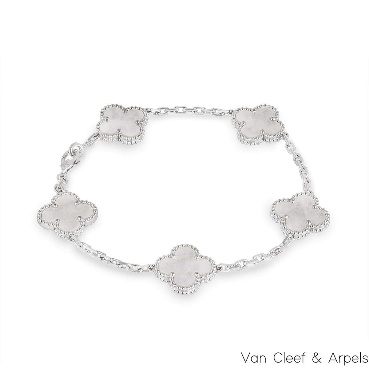 A classic 18k white gold mother of pearl bracelet by Van Cleef and Arpels from the Vintage Alhambra Collection. The stylish bracelet is made up of 5 iconic 4-leaf clover motifs, each set with a beaded edge and mother of pearl inlay, set throughout the length of the chain. The bracelet measures 7.5 inches in length and has a gross weight of 11.30 grams.