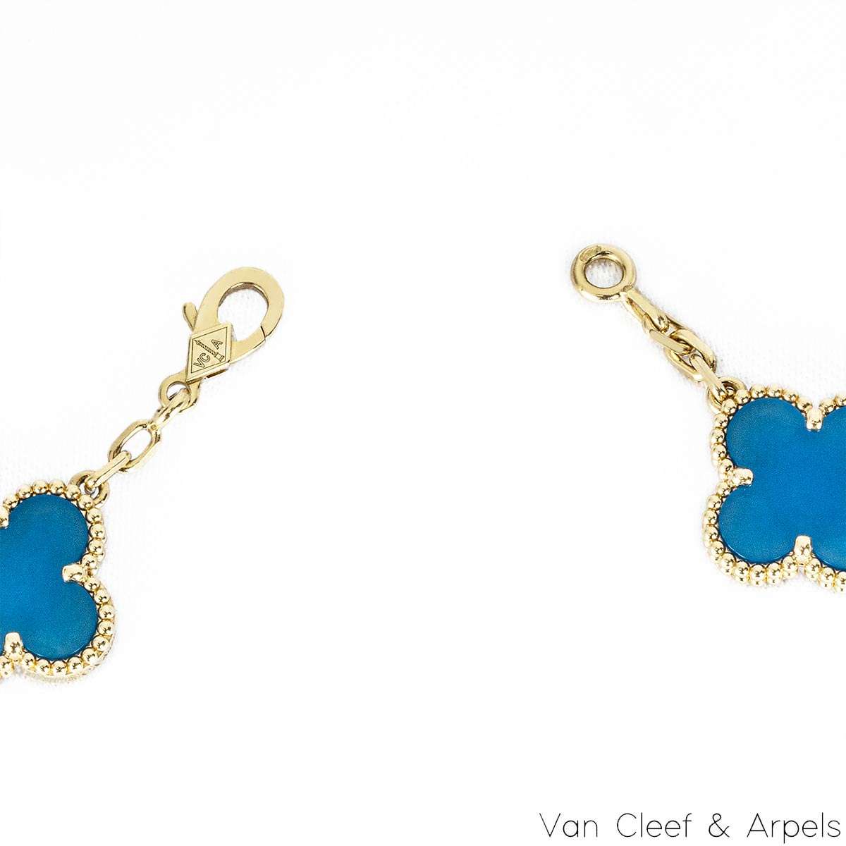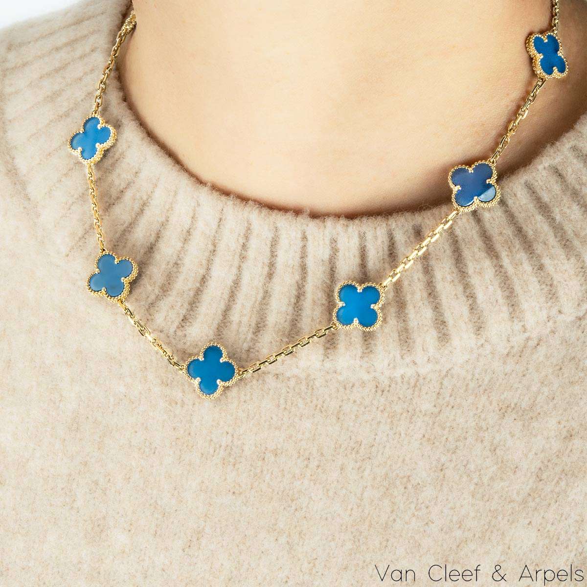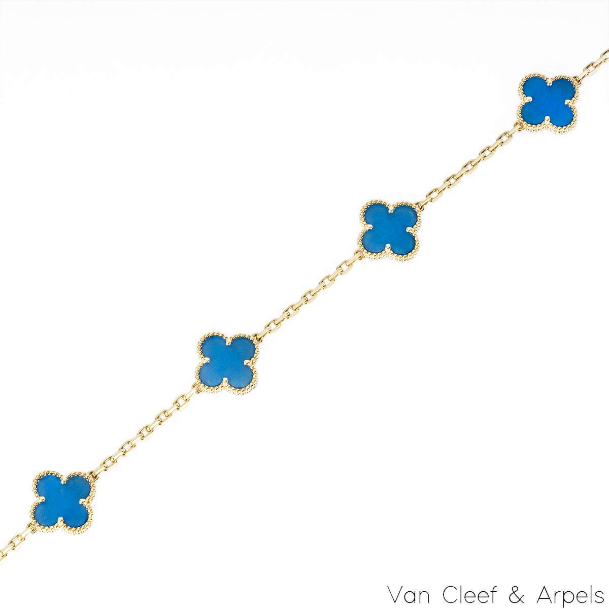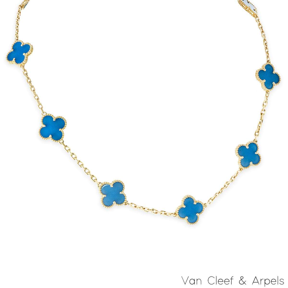An iconic 18k yellow gold and agate Van Cleef and Arpels necklace from the Vintage Alhambra collection. The necklace comprises of 10 iconic 4 leaf clover motifs, each set with a beaded edge and an agate inlay. Measuring 16.5 inches in length, the necklace features a lobster clasp and has a gross weight of 23.6 grams.