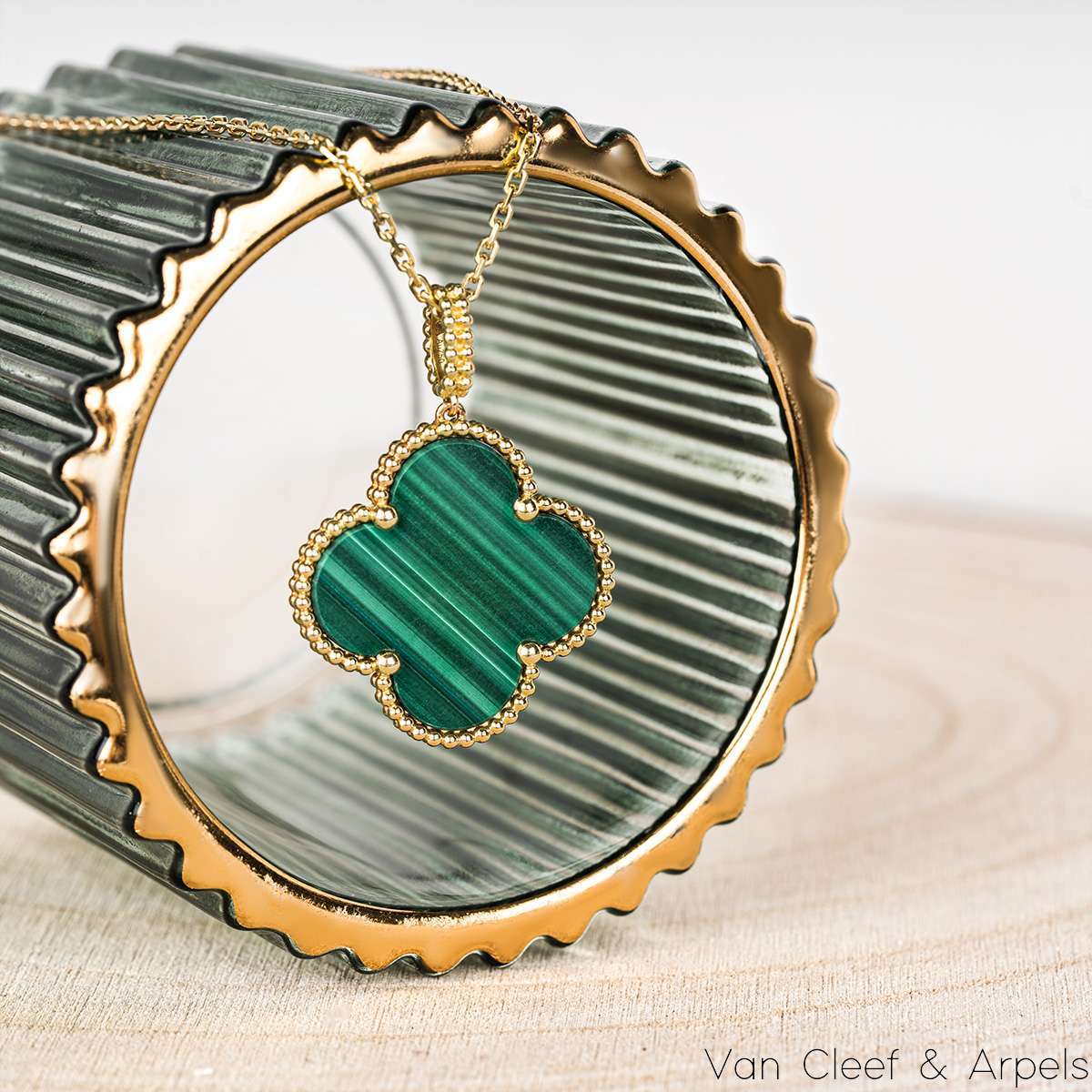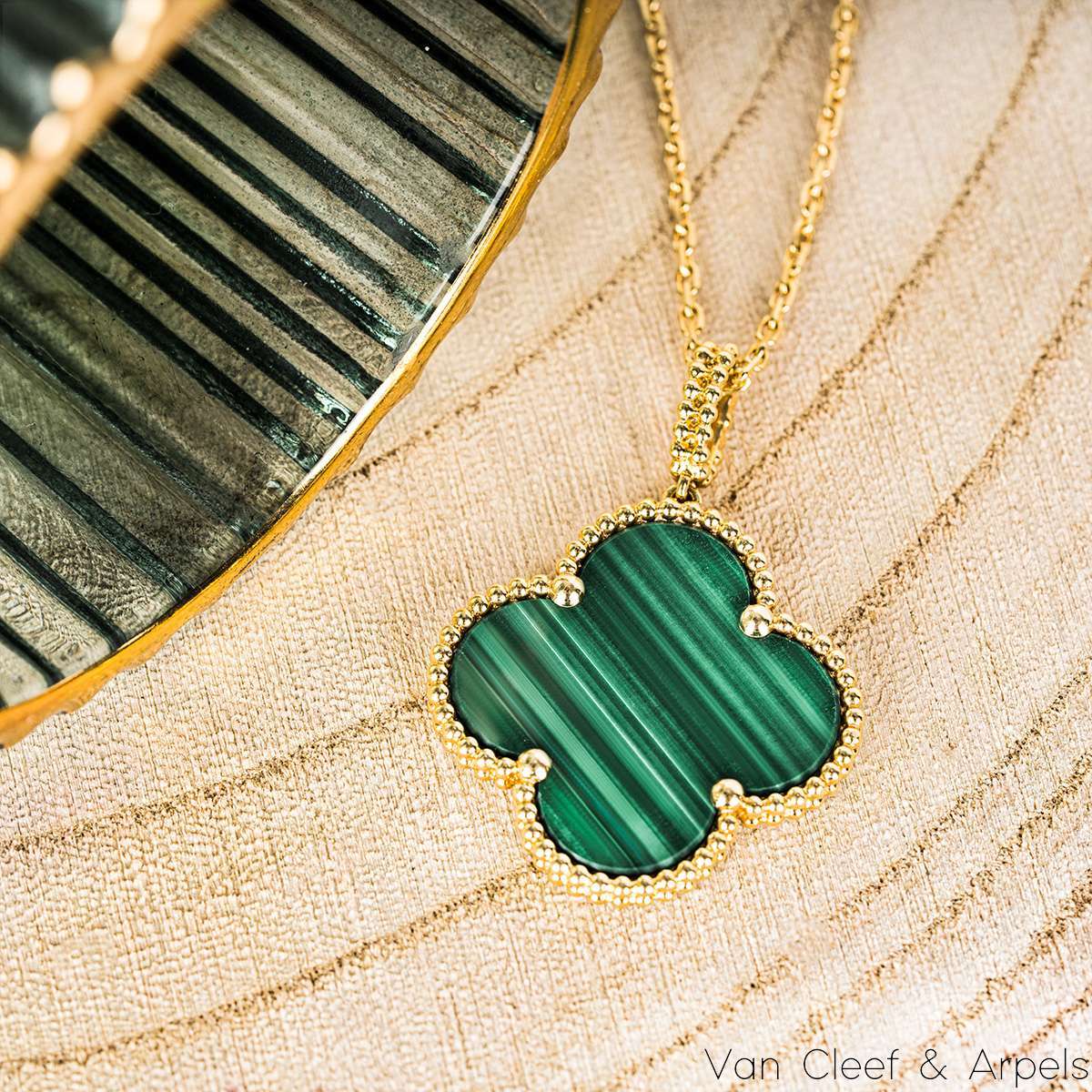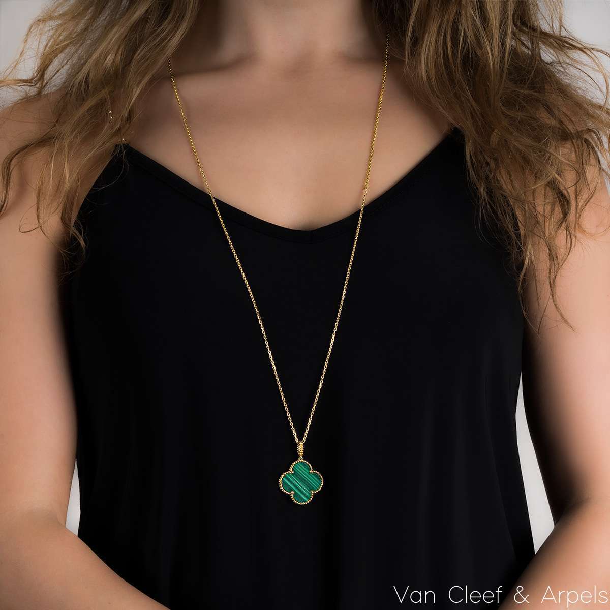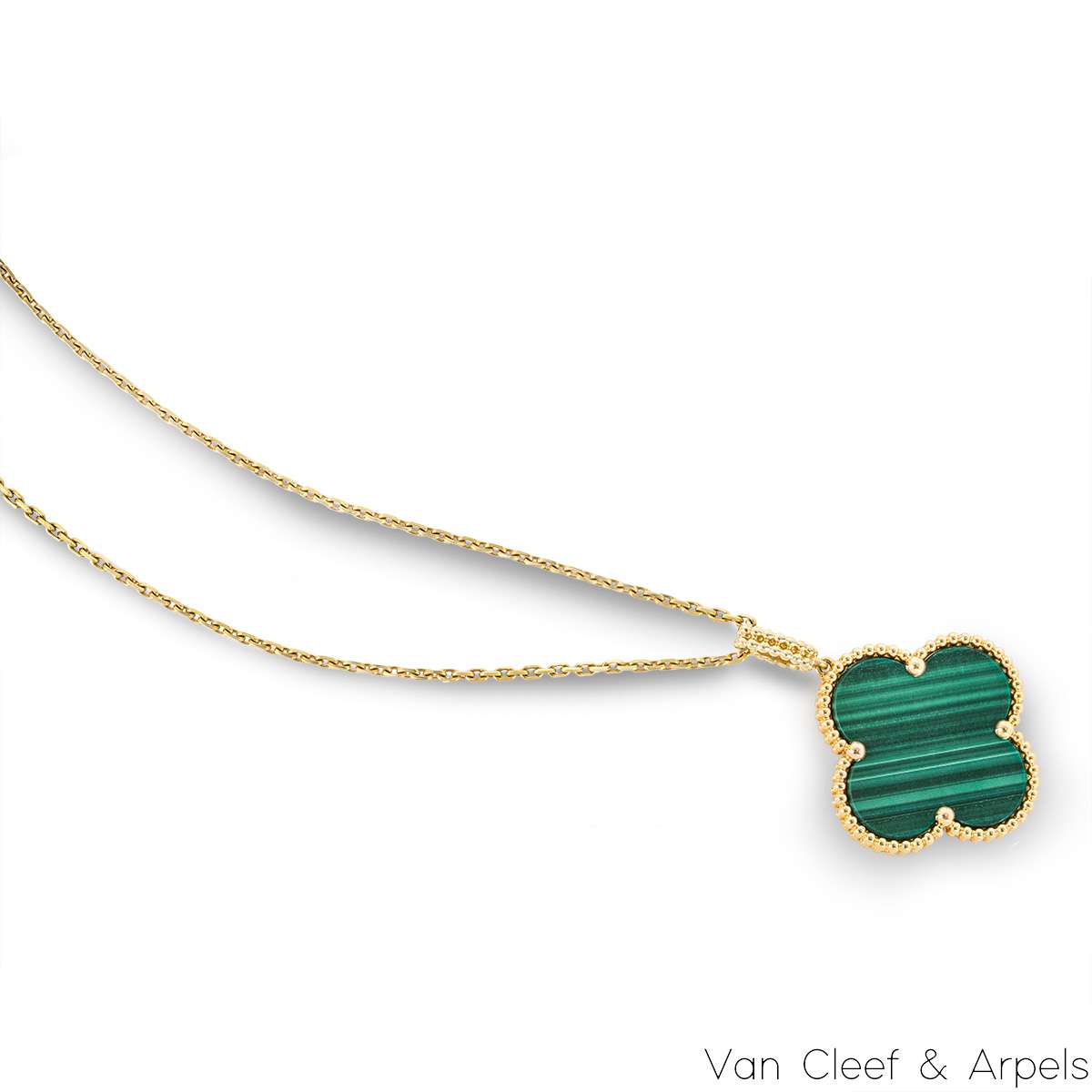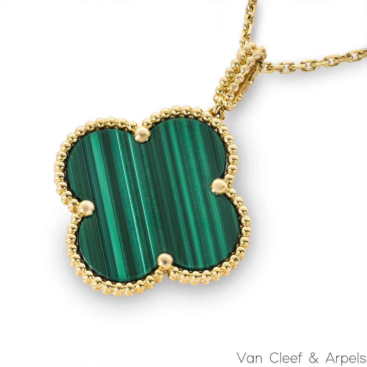 A gorgeous 18k yellow gold malachite long necklace by Van Cleef & Arpels from their Magic Alhambra collection. The necklace comprises of the iconic 4-leaf clover motif pendant set with a malachite inlay, complemented by a beaded edge. Measuring 2.6cm in diameter, the pendant is suspended from an adjustable 36 inch chain. The necklace finishes with the hallmark lobster clasp and has a gross weight of 15.8 grams.