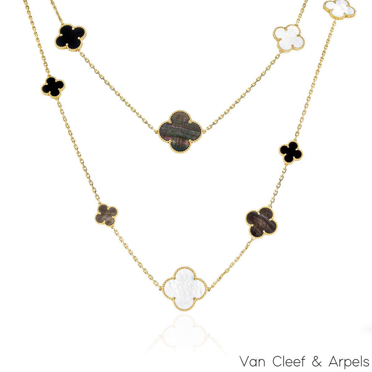 A luxurious 18k yellow gold mother of pearl and onyx bracelet by Van Cleef & Arpels from the Magic Alhambra collection. The bracelet features 5 four leaf clover motifs that vary in size, with 3 motifs set to the centre with mother of pearl inlays and 2 motifs set to the centre with onyx inlays, each complemented with a beaded outer edge. The quatrefoil motifs range in size from 15mm in width to 27mm and are separated by a fine trace link chain. The 7.5 inch bracelet finishes with a lobster clasp and has a gross weight of 18.10 grams.