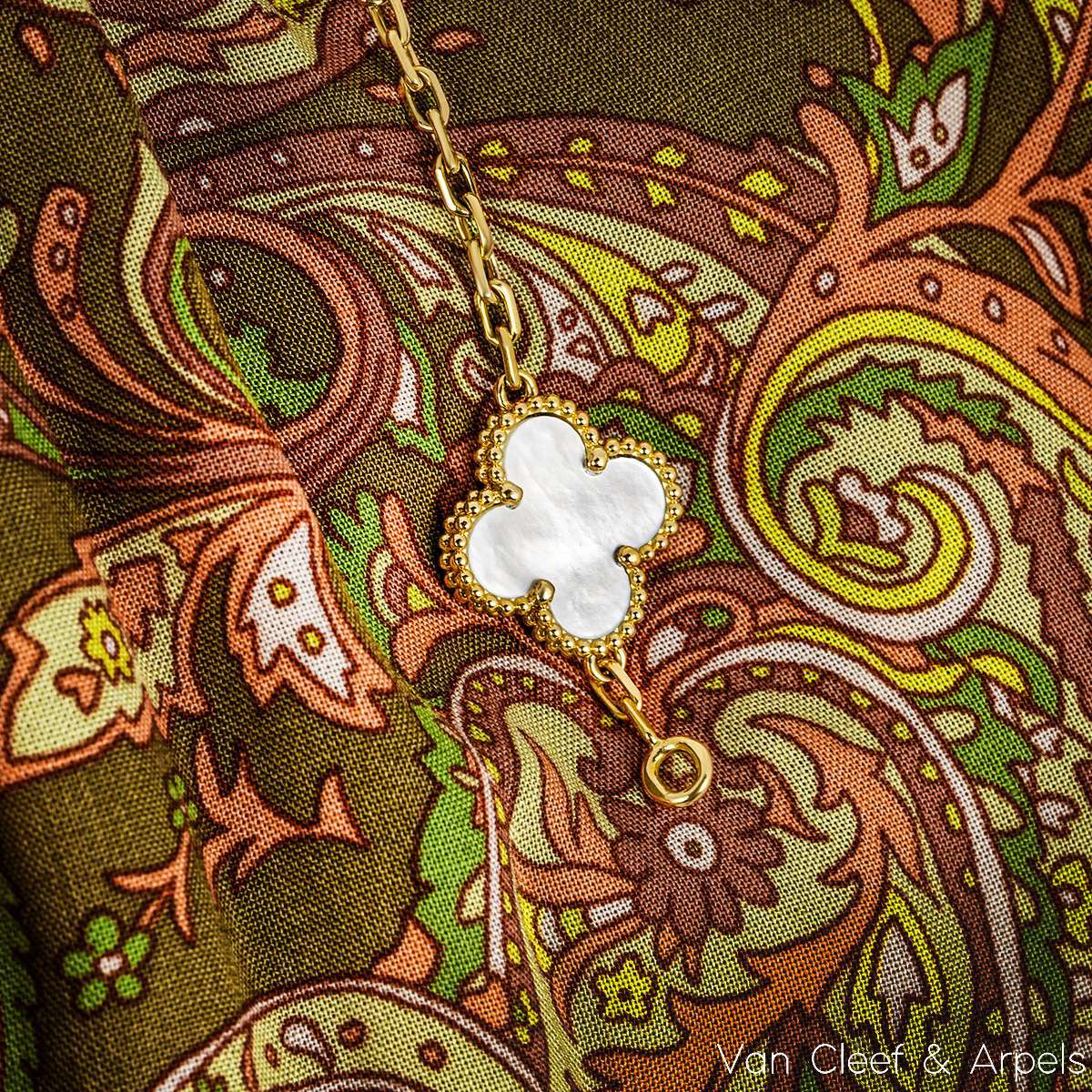 A gorgeous 18k yellow gold mother of pearl bracelet by Van Cleef and Arpels from the Vintage Alhambra Collection. The stylish bracelet is made up of 5 iconic 4 leaf clover motifs, each set with a mother of pearl inlay and finished with a beaded edge. The bracelet measures 7 inches in length and has a gross weight of 11.80 grams.