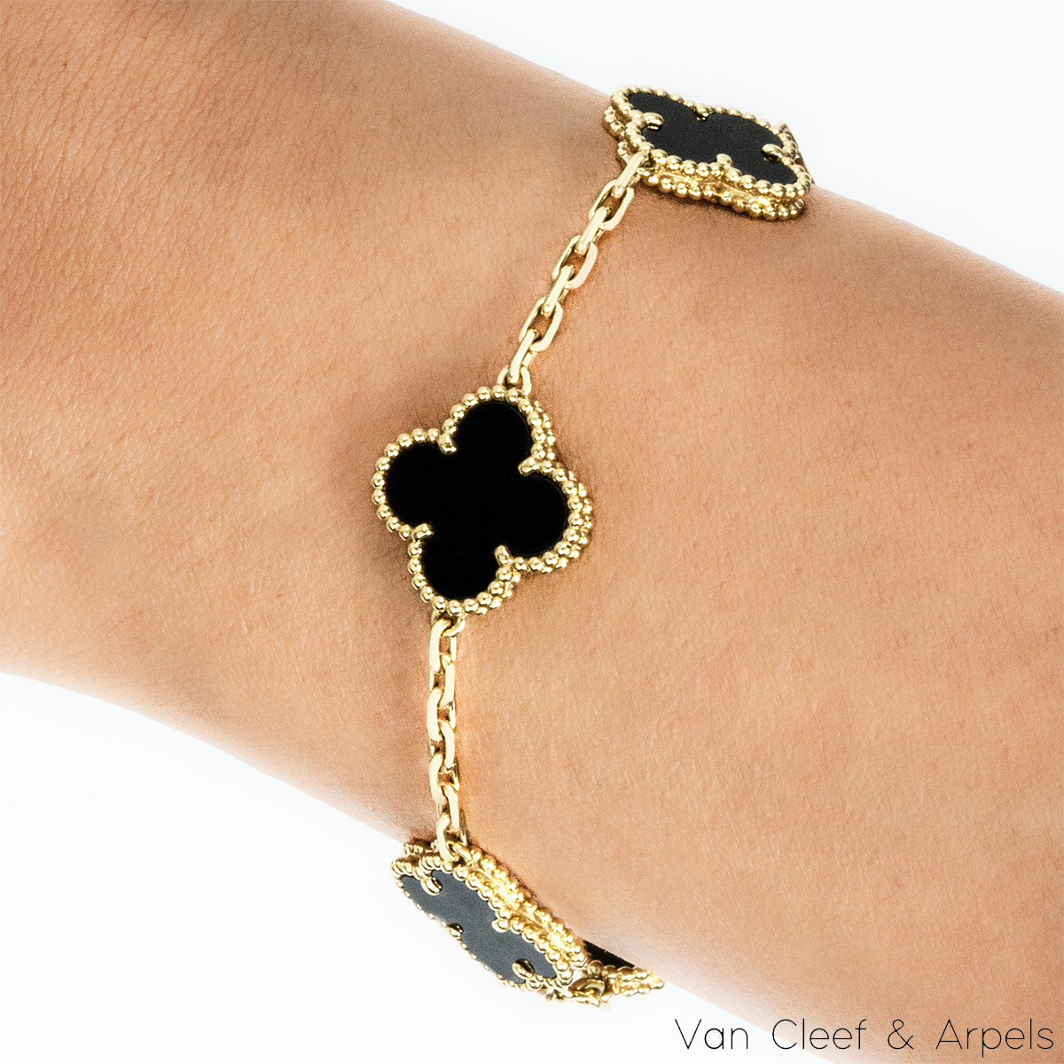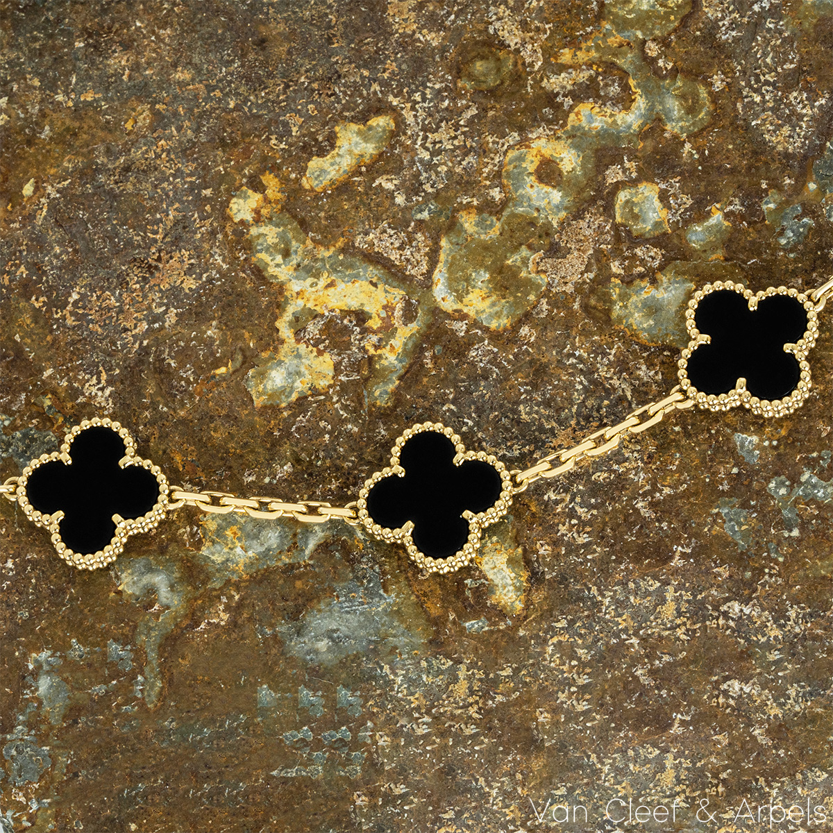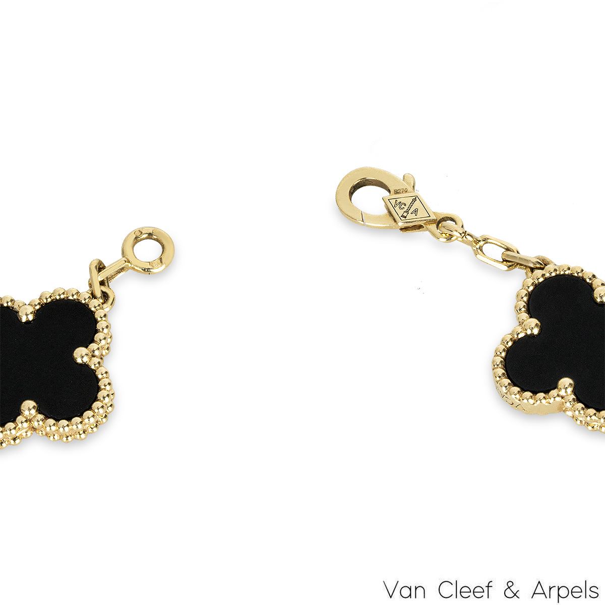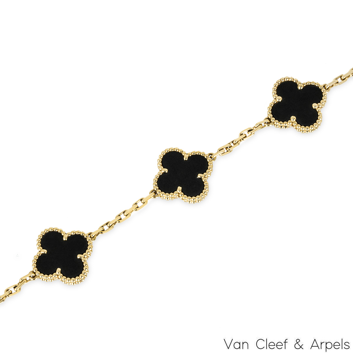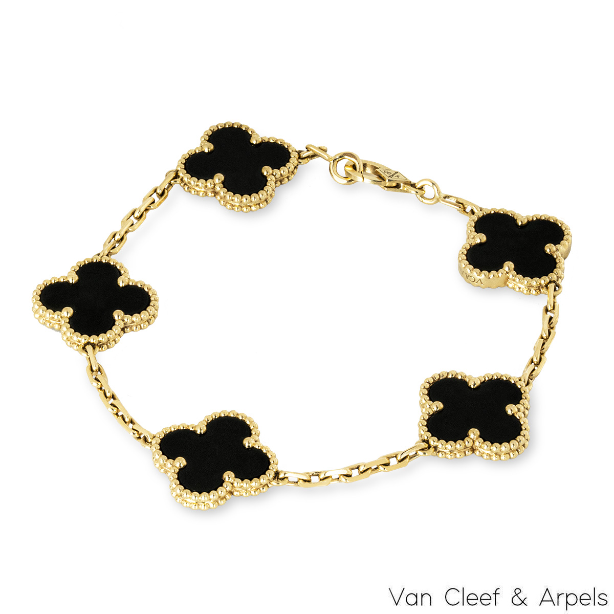 A timeless 18k yellow gold onyx bracelet, from the Vintage Alhambra collection by Van Cleef and Arpels. The bracelet is made up of 5 iconic clover motifs, each set with a beaded edge and a black onyx inlay. Measuring 7.5 inches in length, the bracelet finishes with a lobster clasp and has a gross weight of 11.4 grams.