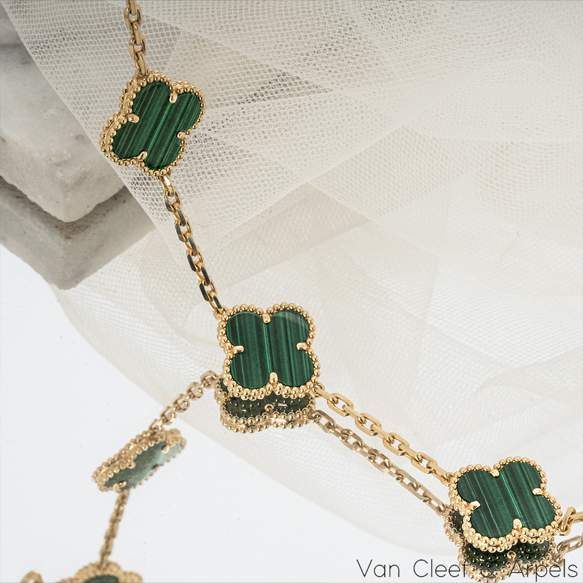 A gorgeous 18k yellow gold malachite bracelet by Van Cleef & Arpels from the Vintage Alhambra collection. The bracelet features 5 iconic 4 leaf clover motifs, each set with a beaded edge and a malachite inlay, set throughout the length of the chain. The bracelet measures 7.5 inches in length, finishes with a lobster clasp fitting and has a gross weight of 13.21 grams.