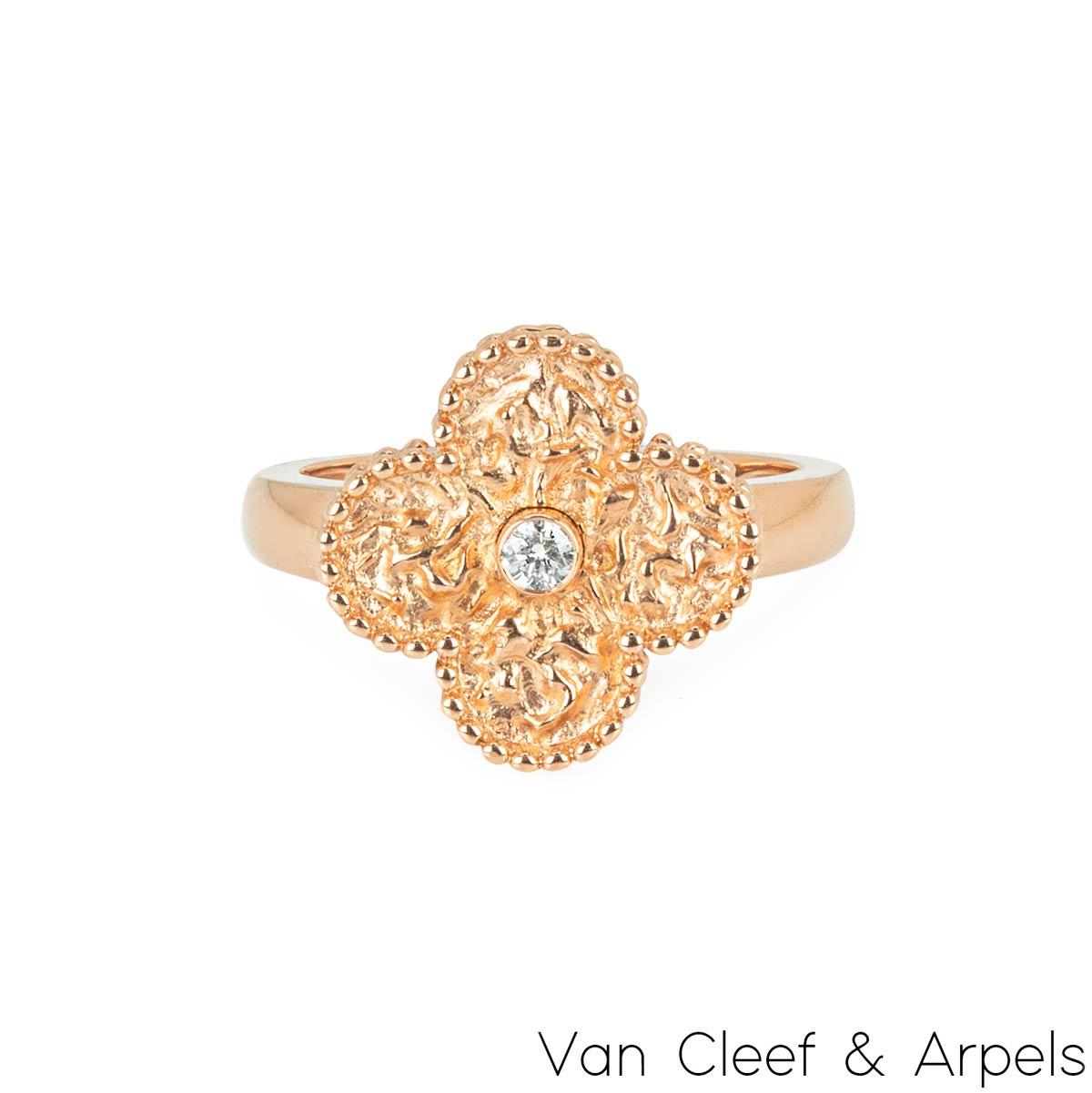 A stunning 18k rose gold Vintage Alhambra ring by Van Cleef & Arpels. The textured quatrefoil motif is set to the centre with a single round brilliant cut diamond in a bezel setting with an approximate weight of 0.05ct, E-F colour and VS clarity. It is further complemented with a beaded edge. The ring measures 2.5mm wide, is a size N and has a gross weight of 8.31 grams.