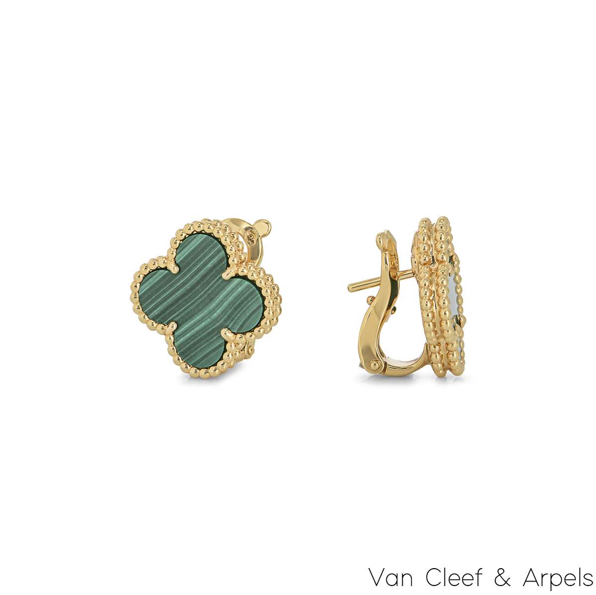 A beautiful pair of 18k yellow gold Van Cleef & Arpels earrings from the Vintage Alhambra collection. The earrings are composed of a four leaf clover motif, with a malachite insert set to the centre, complimented by a beaded edge. The earrings measure 15mm in width and feature post and lever-hinged fittings. The earrings have a gross weight of 7.70 grams.