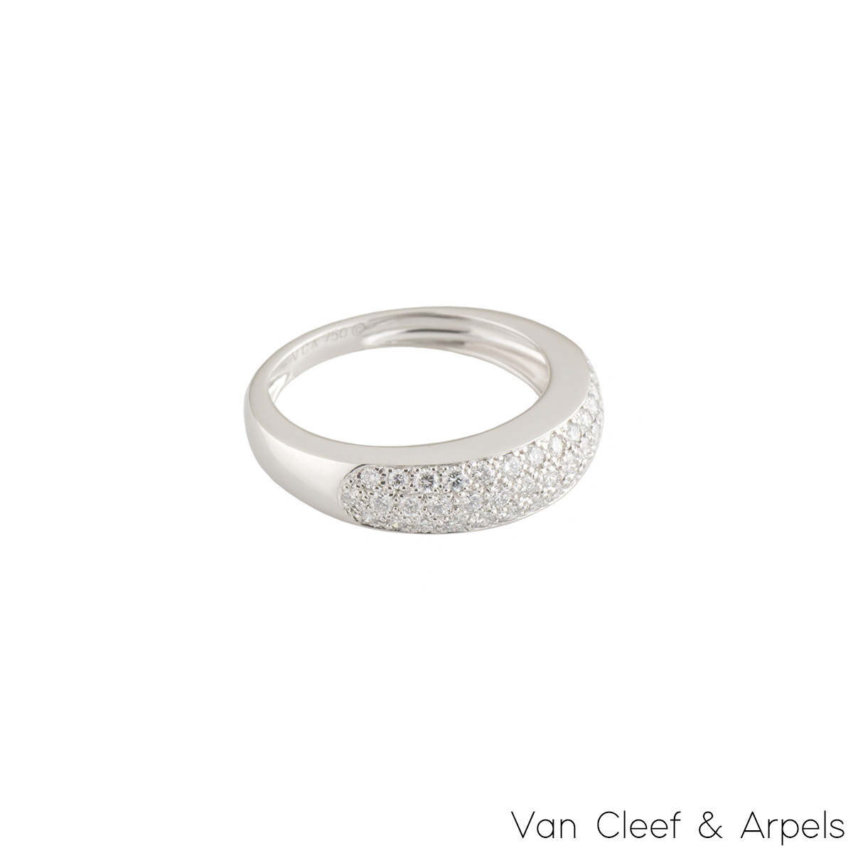 A sparkly 18k white gold diamond Van Cleef & Arpels ring. The ring comprises of 3 rows of round brilliant cut diamonds in a pave setting, with a total weight of approximately 0.56ct, predominantly F colour and VS+ clarity. The ring is a size I½ but can be adjusted for a perfect fit. The ring measures 5mm at the widest point and tapers down to 2mm and has a gross weight of 3.30 grams.