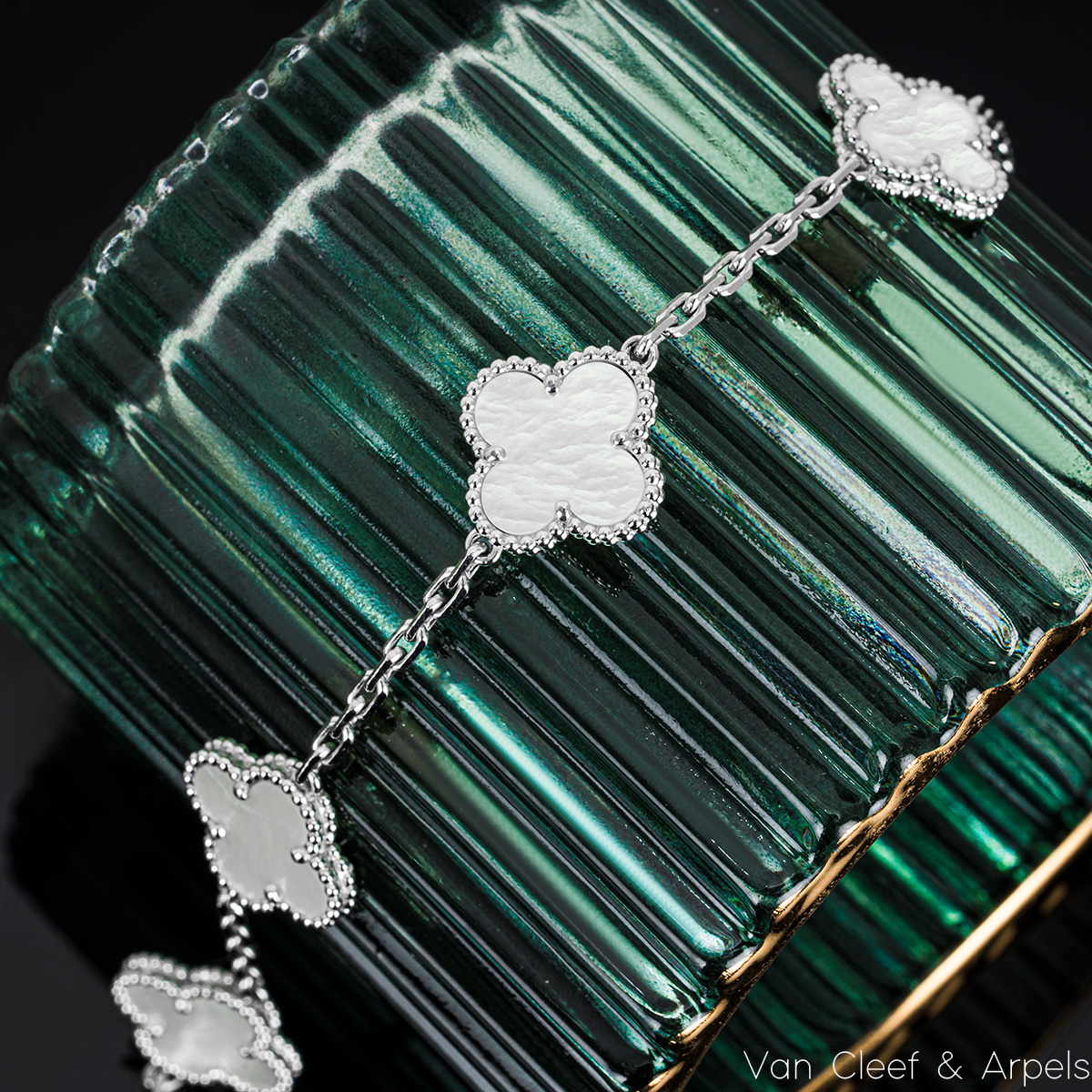 A classic 18k white gold mother of pearl bracelet by Van Cleef and Arpels from the Vintage Alhambra Collection. The stylish bracelet is made up of 5 iconic 4-leaf clover motifs, each set with a beaded edge and mother of pearl inlay, set throughout the length of the chain. The bracelet measures 7.5 inches in length and has a gross weight of 12.63 grams.