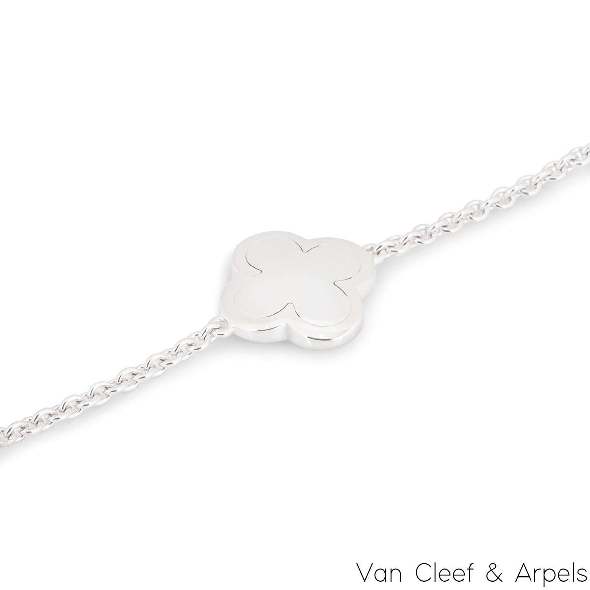 A stunning 18k white gold necklace from the Alhambra collection by Van Cleef & Arpels. The necklace is made up of 9 four leaf clover motifs with a polished white gold boarder and centre. The necklace measures 16 inches in length and has a concealed clasp. The necklace has a gross weight of 45.8 grams.