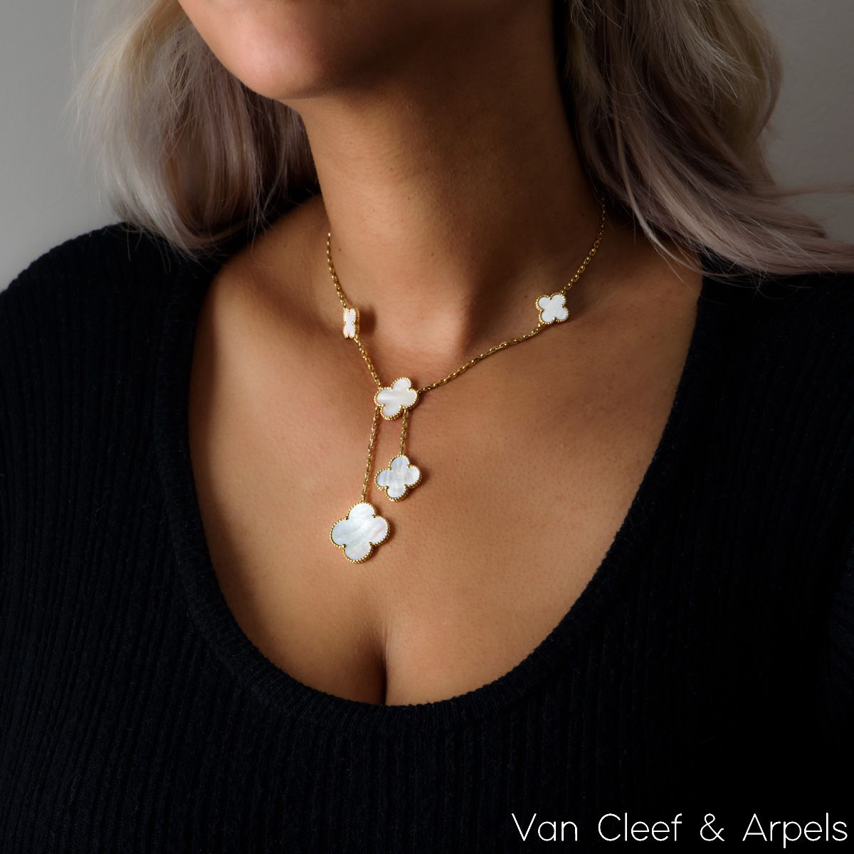 A luxurious 18k yellow gold mother of pearl necklace by Van Cleef & Arpels from the Magic Alhambra collection. The necklace features 6 four leaf clover motifs set to the centre with mother of pearl and complemented by a beaded outer edge. The quatrefoil motifs range in size from 15mm in width to 25mm and are separated by a fine trace link chain. The adjustable 14-16.5 inch necklace, finishes with a lobster clasp and has a gross weight of 26.48 grams.