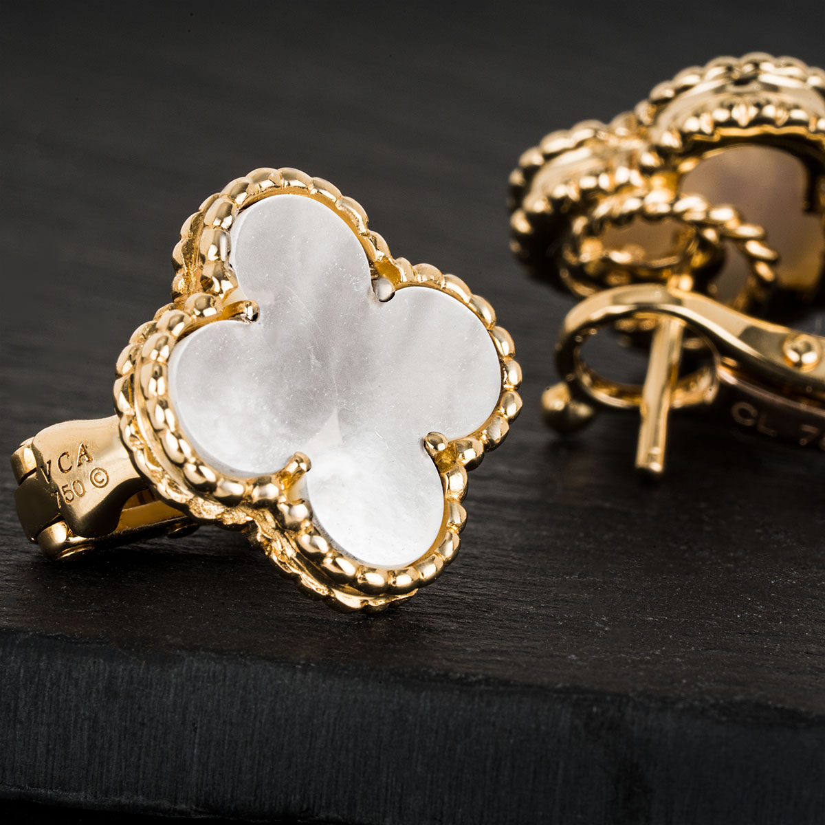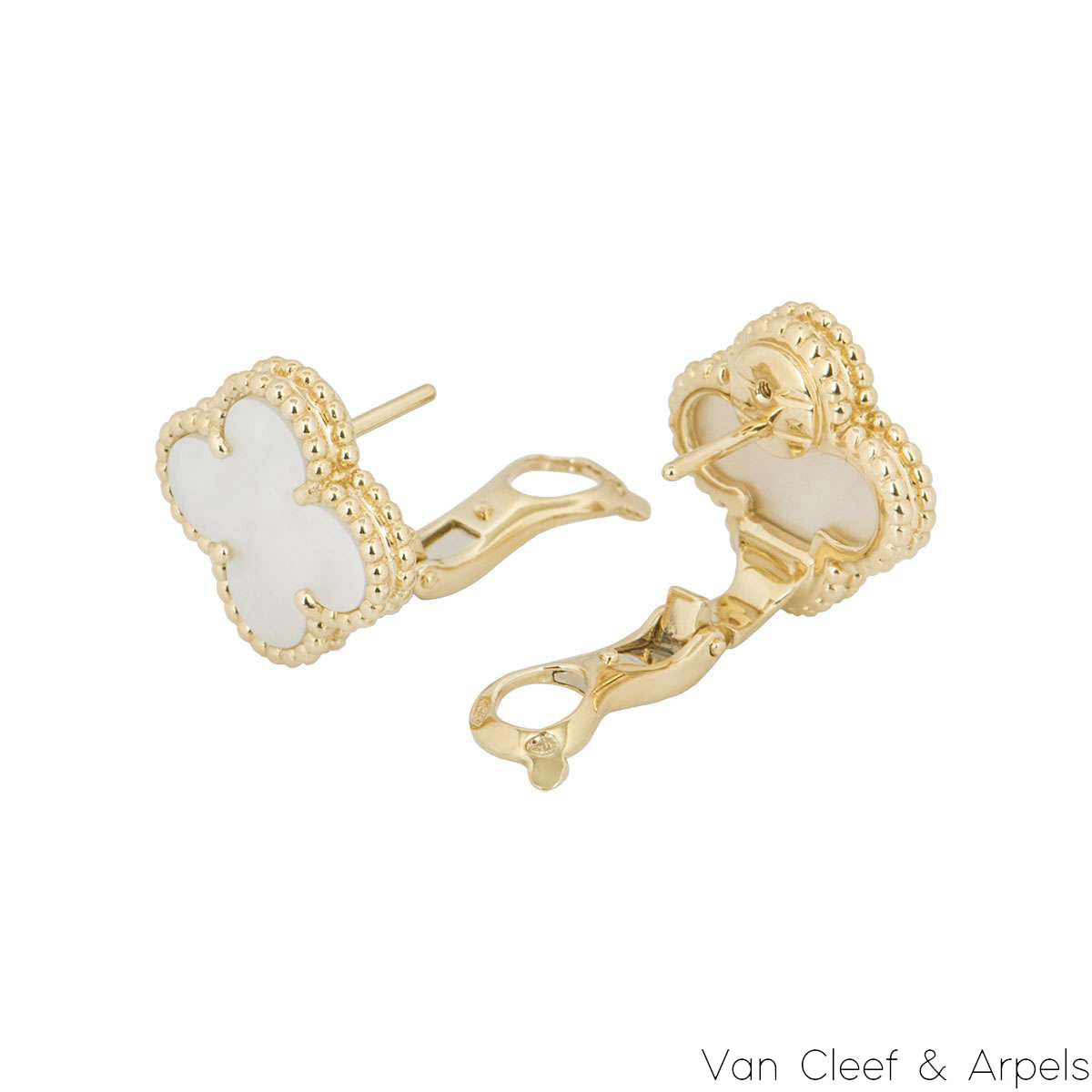 A beautiful pair of 18k yellow gold mother of pearl Van Cleef & Arpels earrings from the Vintage Alhambra collection. The earrings feature the iconic 4-leaf clover motif, with a mother of pearl inlay set to the centre, complemented by a beaded edge. The 1.5cm wide earrings feature post and lever-hinged fittings and have a gross weight of 7.50 grams.