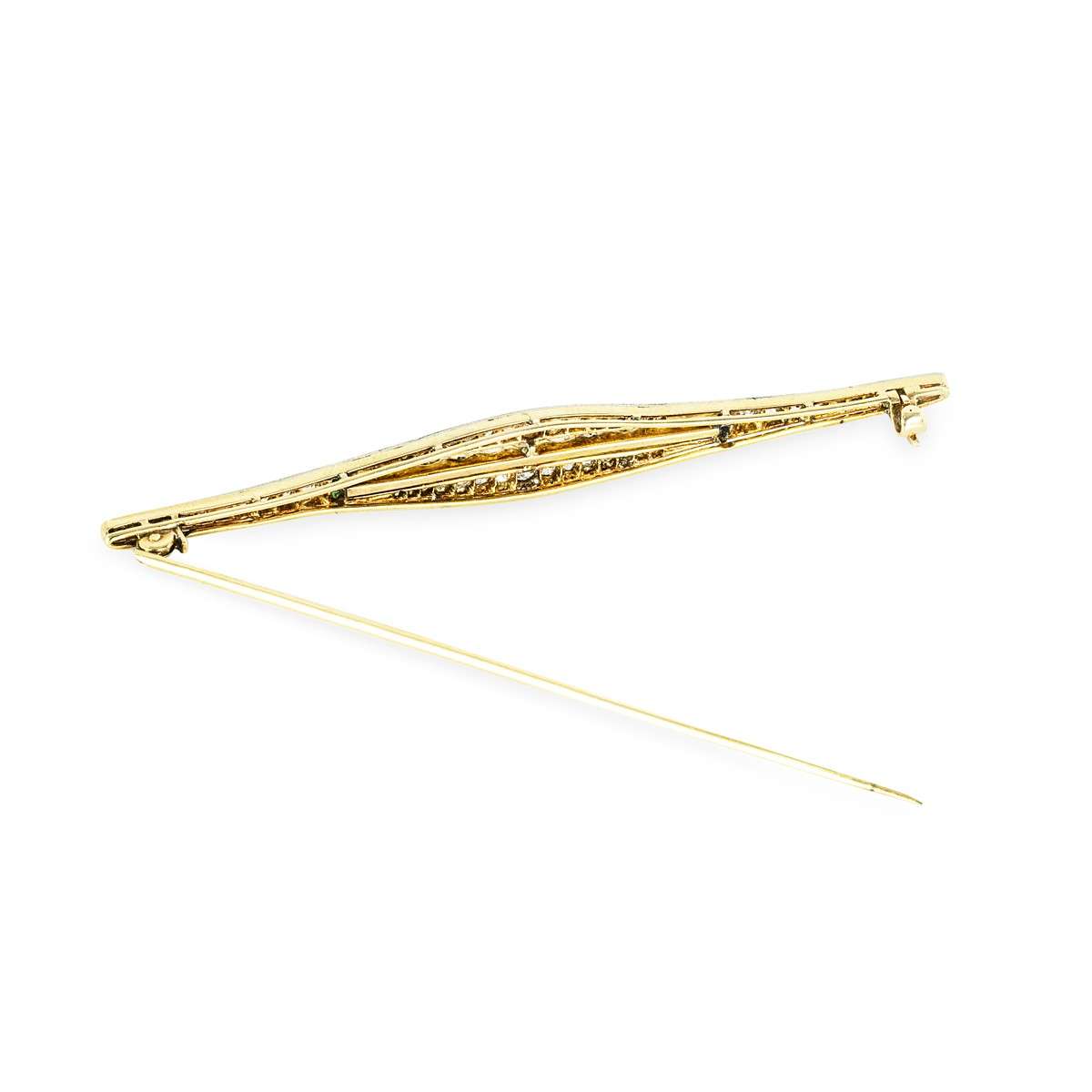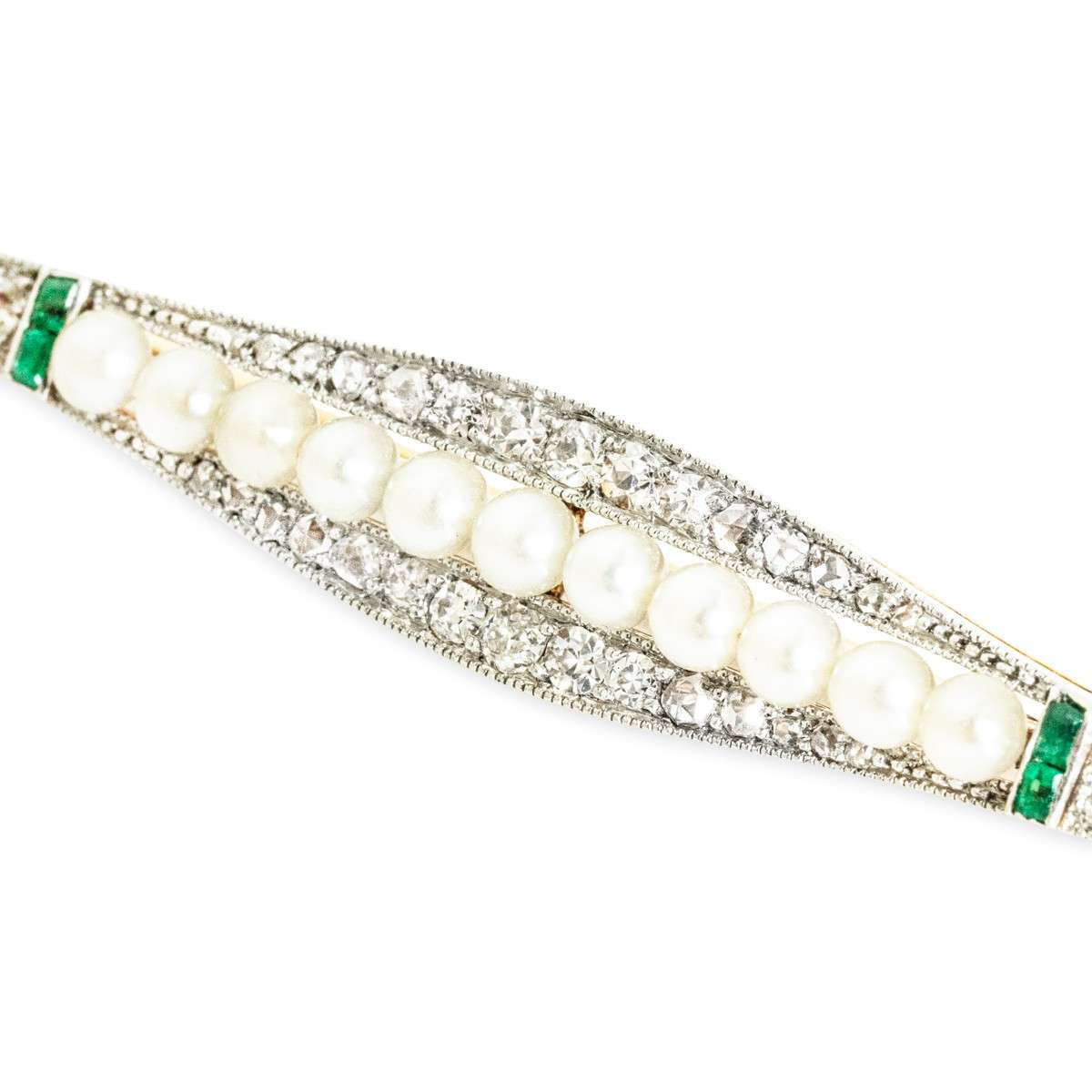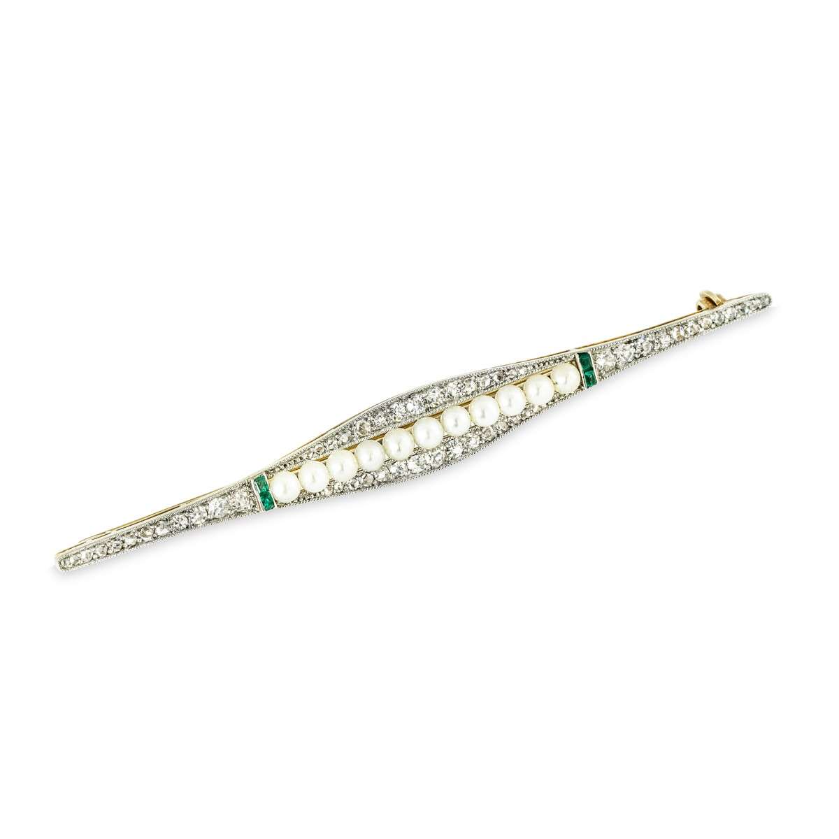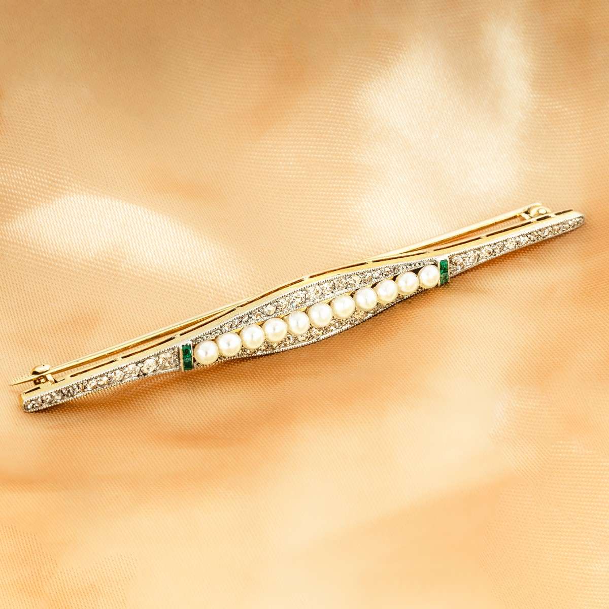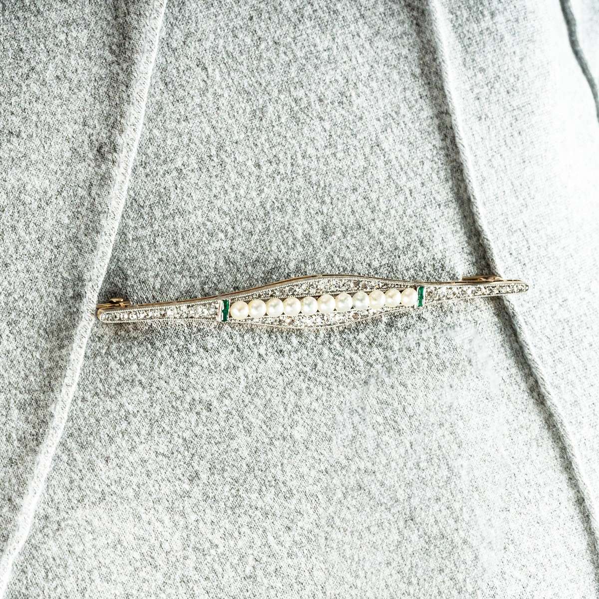 A stunning brooch crafted in a luxurious blend of white and gold, measuring 7 cm in length with a gross weight of 5.5 grams. This elegant piece features 2 vibrant emeralds, 11 lustrous pearls, and 54 small brilliant-cut diamonds, creating a timeless design that exudes sophistication.