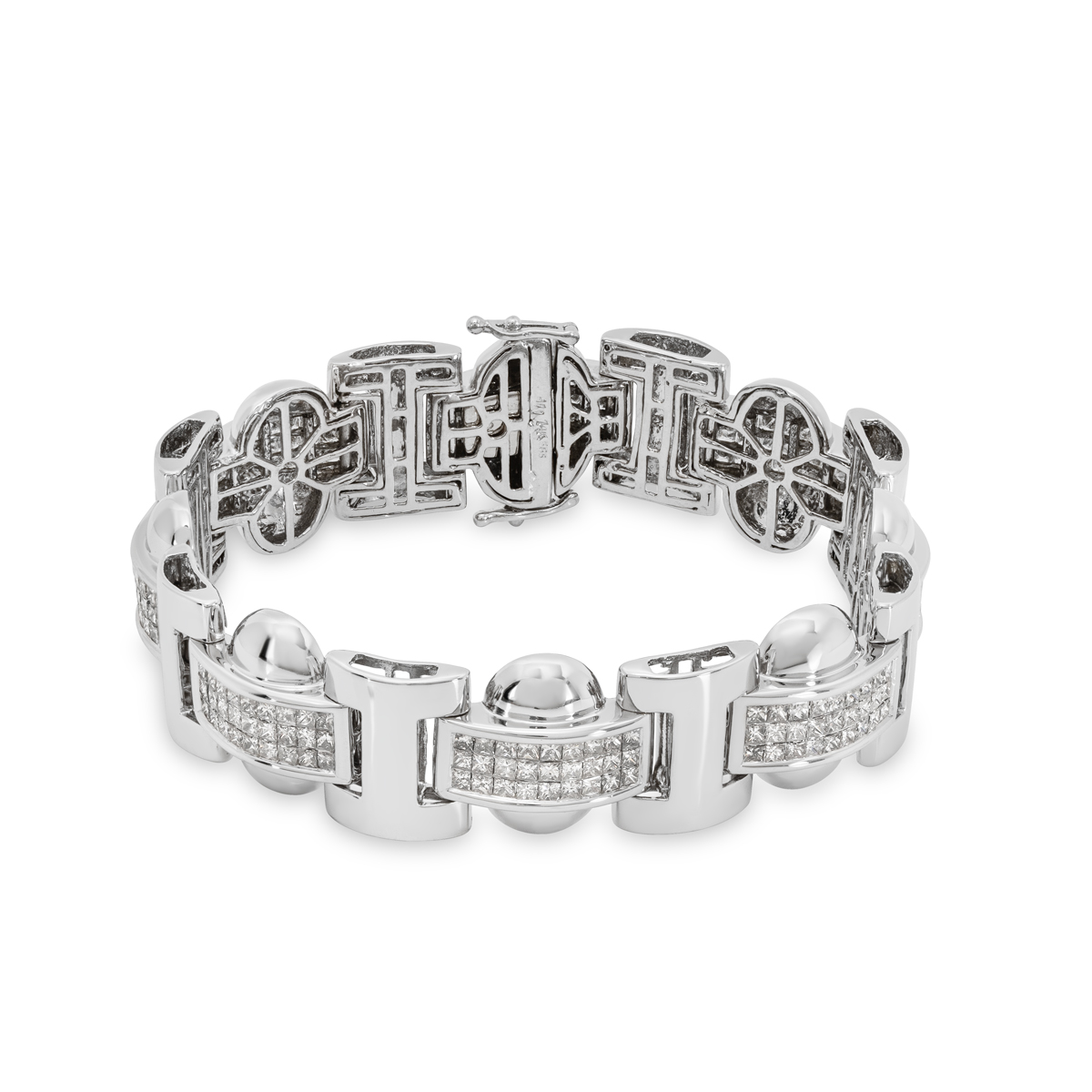 An intricate 14k white gold diamond link bracelet. The bracelet alternates between high polish links and diamond set links. The diamond links are invisible set with 210 princess cut diamonds with an approximate total weight of 5.25ct, H-I colour and SI clarity. The 15mm wide bracelet fits a wrist size up to 7 inches, finishes with a push clasp with figure 8 safety clasps on either side and has a gross weight of 36.41 grams.