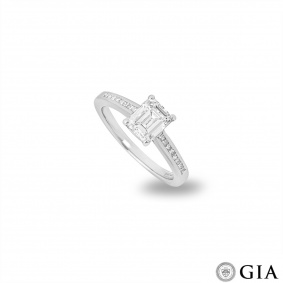 A modern 18k white gold diamond three-stone ring. The engagement ring is set to the centre with an emerald cut diamond weighing 1.00ct, F colour and VS1 clarity. Accentuating the centre diamond are 2 tapered baguettes tension set to the shoulders with an approximate total weight of 0.15ct, well matched in colour and clarity. The 2mm ring has a gross weight of 3.10 grams and is currently a size K½ but can be adjusted for the perfect fit.