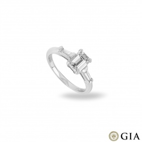 A lovely 18k white gold diamond engagement ring. The three stone ring is set to the centre with an emerald cut diamond weighing 1.01ct, E colour and SI1 clarity. Accentuating the centre diamond are tapered baguette cut diamonds set to the shoulders with an approximate total weight of 0.13ct, F-G colour and SI clarity. The ring measures 2mm in width, has a gross weight of 2.84 grams and is currently a size N but can be adjusted for the perfect fit.