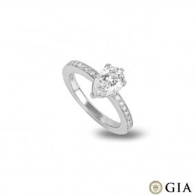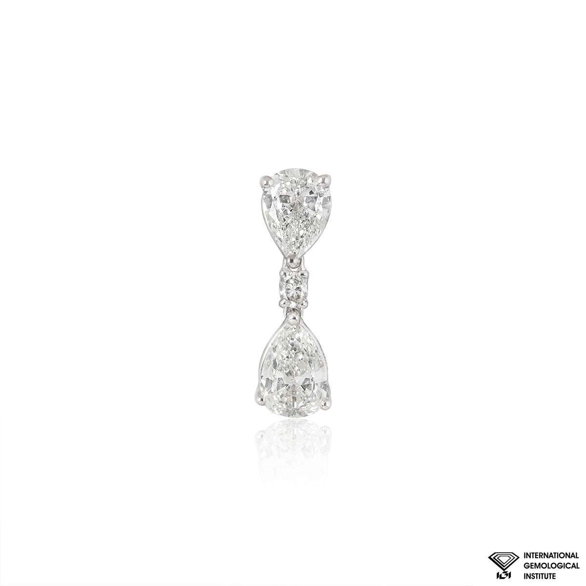 A unique 18k white gold diamond drop pendant. The pendant features 2 pear cut diamonds linked with a single oval cut diamond weighing approximately 0.07ct. The top pear cut diamond, set in a three-prong mount, weighs 0.70ct, is F colour and VS1 clarity. The bottom pear cut diamond, set in a three-prong mount, weighs 0.81ct, is G colour and VS2 clarity. The 2cm long pendant is suspended from a 16-inch trace chain, finishes with a lobster clasp and has a gross weight of 5.3 grams.
