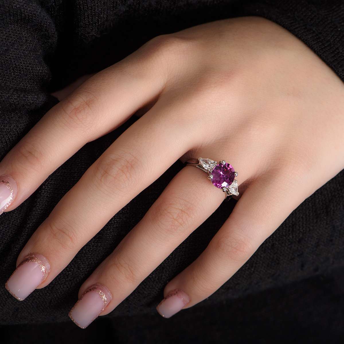 A beautiful 18k white gold pink sapphire and diamond ring. The pink oval step-cut sapphire weighs 2.44ct and displays signs of heat treatment. Set to either side of the sapphire are 2 pear cut diamonds with a total weight of 0.61ct. The ring has a gross weight of 5.4 grams and is currently a size M½ which can be adjusted for a perfect fit.
